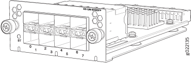 Este módulo de vínculo ascendente puede alojar hasta ocho transceptores SFP+, ocho transceptores SFP o una combinación de transceptores SFP+ y SFP en los ocho puertos del módulo de vínculo ascendente. También puede configurar estos puertos como VCP y utilizarlos para conectar el conmutador en una configuración de Virtual Chassis o VCF mediante transceptores SFP+. |
