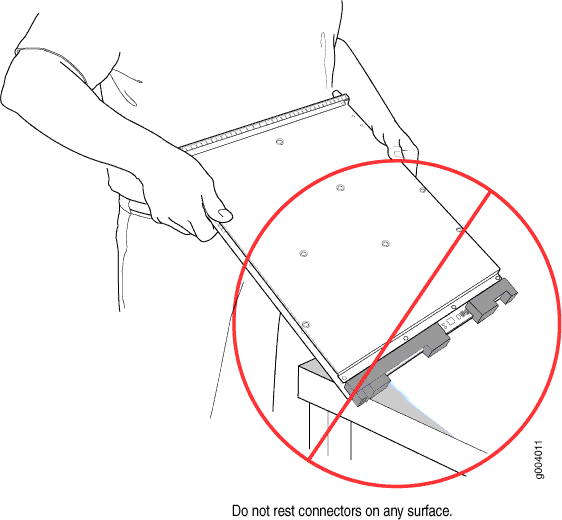 Figura 2: No apoyar el borde de una tarjeta de línea sobre una superficie Do Not Rest the Edge of a Line Card on a Hard Surface dura