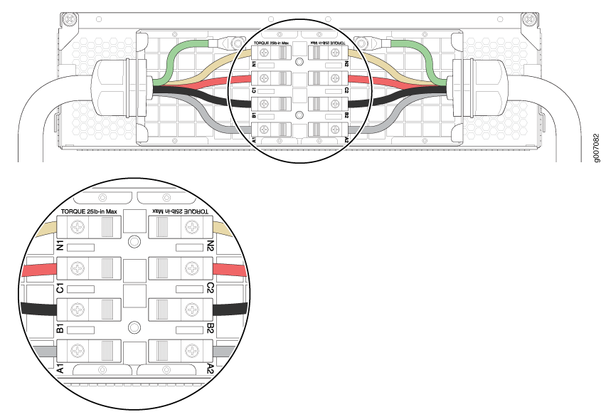 El AC PDM de wye trifásica debe instalarse y protegerse en el chasis antes de conectar los cables de entrada de alimentación. Si se debe quitar el PDM, ambos cables de alimentación de entrada se deben desinstalar y quitar del PDM antes de que el PDM se pueda quitar del chasis. El chasis de la serie MX no es sensible a la secuencia de rotación de fases, ya sea CW o CCW funcionarán correctamente.