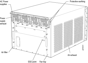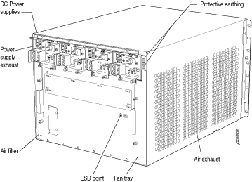 El chasis del enrutador es una estructura rígida de chapa metálica que alberga todos los demás componentes del enrutador (consulte las Figuras 1, 2 y 3). El chasis mide 14.0 pulg. (35,6 cm) de alto, 17,45 pulg. (44,3 cm) de ancho y 24,5 pulgadas. (62,2 cm) de profundidad (desde la parte delantera hasta la parte trasera del chasis). El chasis se instala en gabinetes cerrados estándar de 800 mm (o más) de 19 pulgadas. bastidores de equipos o bastidores de marco abierto de telecomunicaciones. Se pueden instalar hasta cinco enrutadores en un bastidor estándar de 48 U si el bastidor puede soportar su peso combinado, que puede ser superior a 818 lb (371,0 kg).