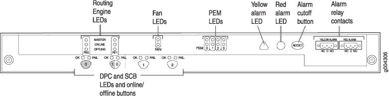 La interfaz artesanal le permite ver información de estado y solución de problemas de un vistazo y realizar muchas funciones de control del sistema. Es insertable en caliente y extraíble en caliente. La interfaz de la nave se encuentra en la parte frontal del enrutador sobre la caja de la tarjeta y contiene LED para los componentes del enrutador, los contactos del relé de alarma y el botón de corte de alarma. Consulte la figura 4.