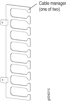 Los soportes de administración de cables (consulte la Figura 6 y la Figura 7) consisten en divisores de plástico ubicados en los lados izquierdo y derecho de cada ranura DPC, FPC o MPC y ranura SCB. Los soportes de administración de cables le permiten enrutar los cables fuera del enrutador y lejos de los DPC, MPC, MIC, PIC y SCB.