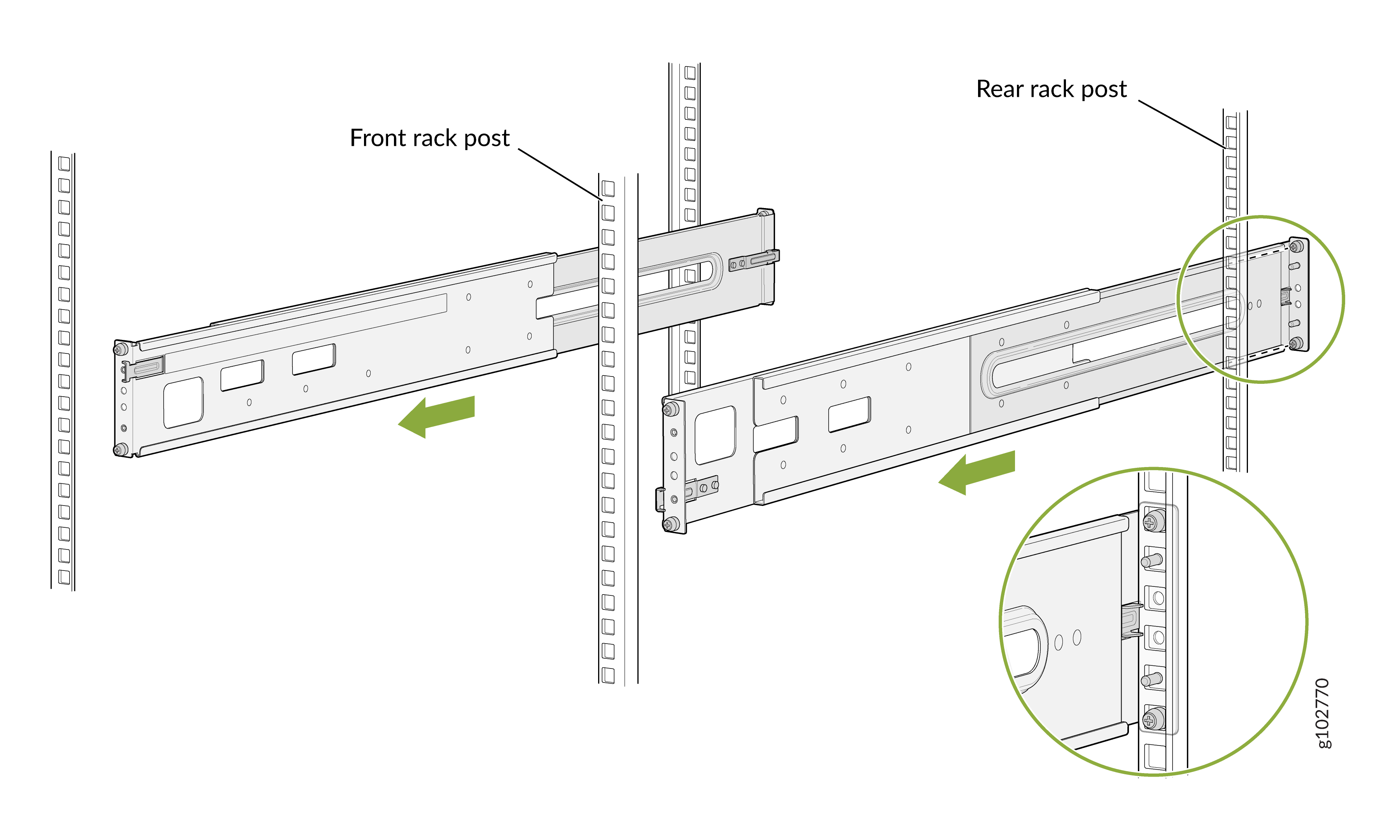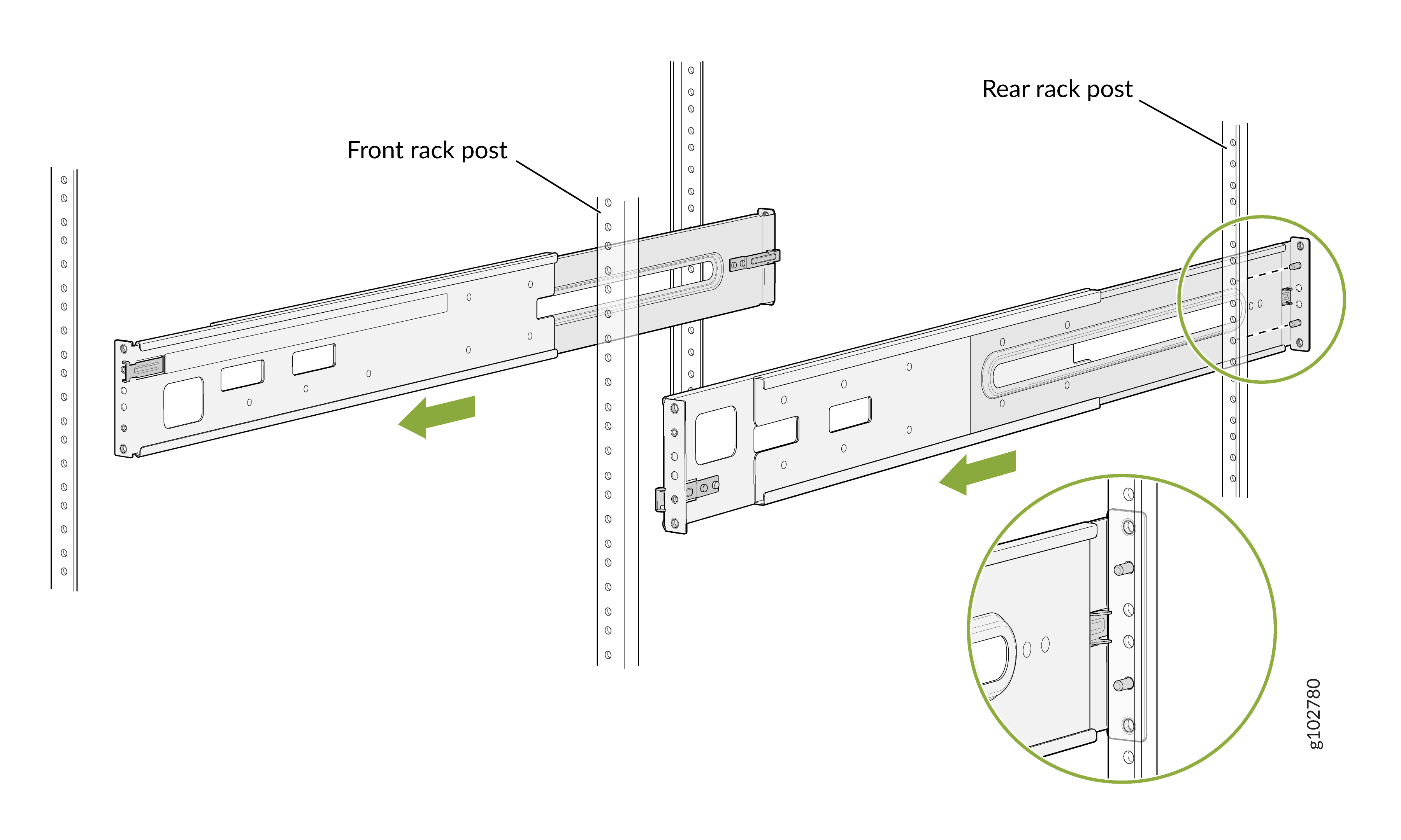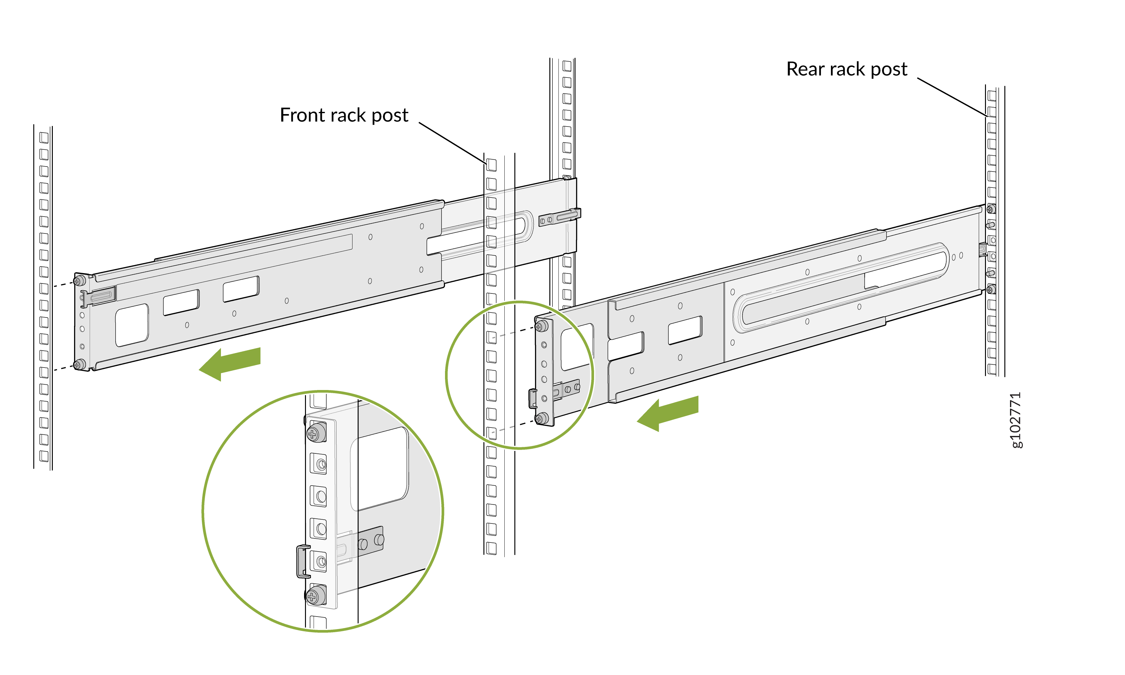 Cuatro puestos de un 19-in. Bastidor o gabinete de cuatro postes mediante el kit de montaje de cuatro postes (número de pieza: JNP10002-4P-TL-RMK), suministrado