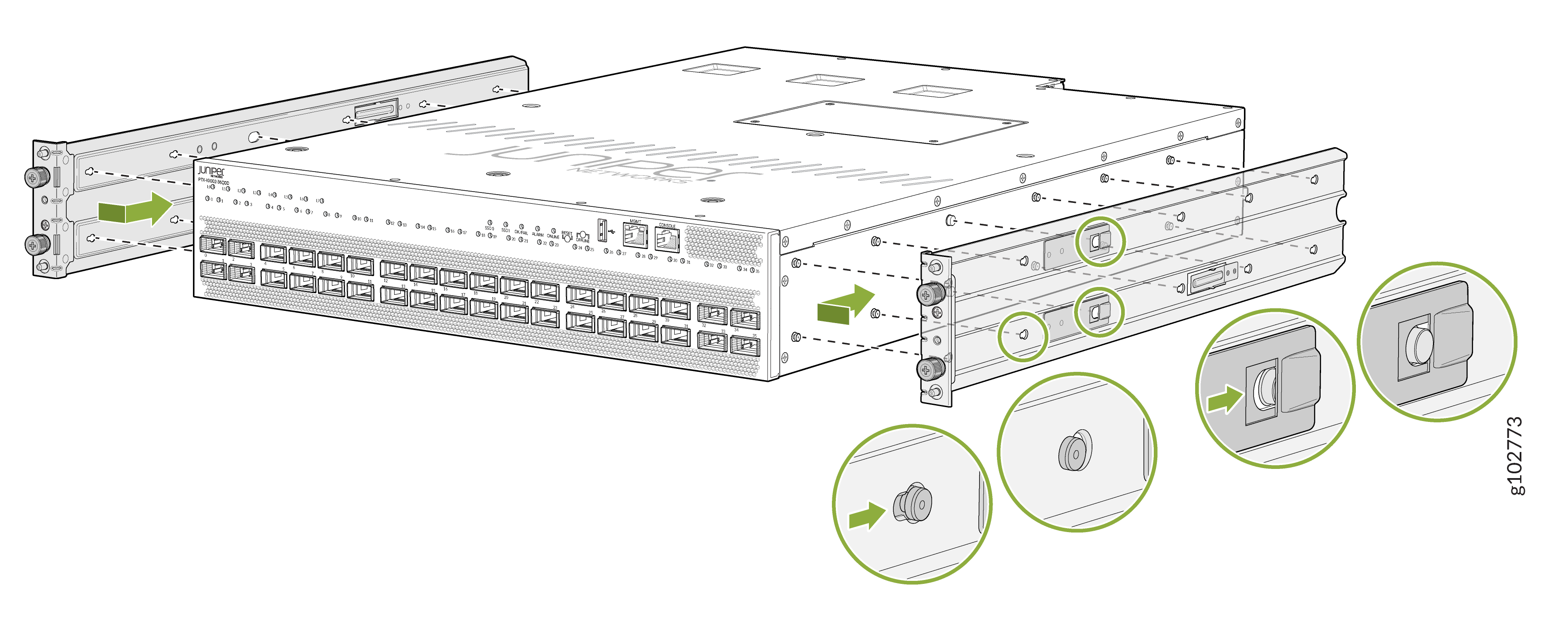 Monte el PTX10002-36QDD en un bastidor de cuatro postes con orificio roscado