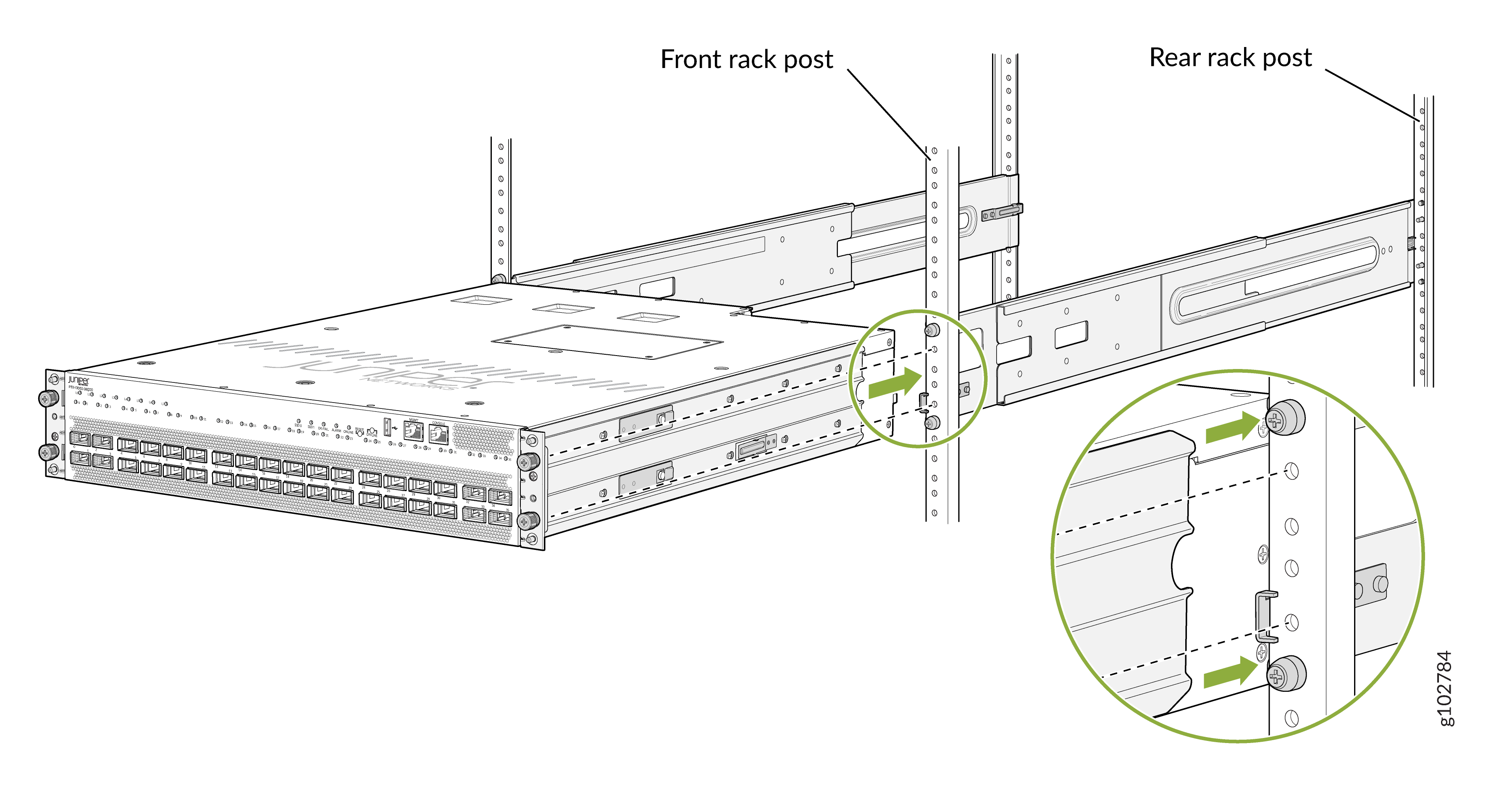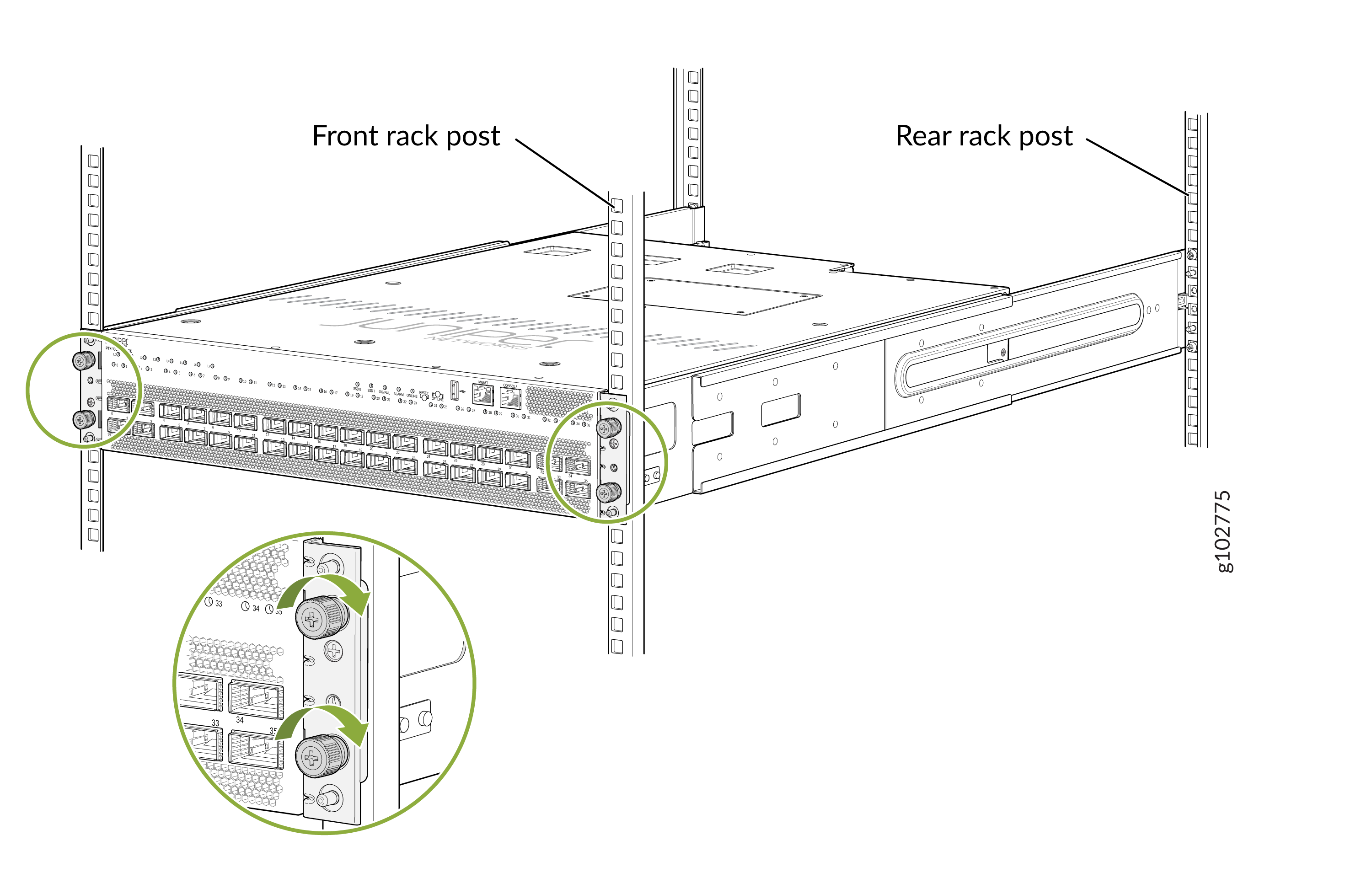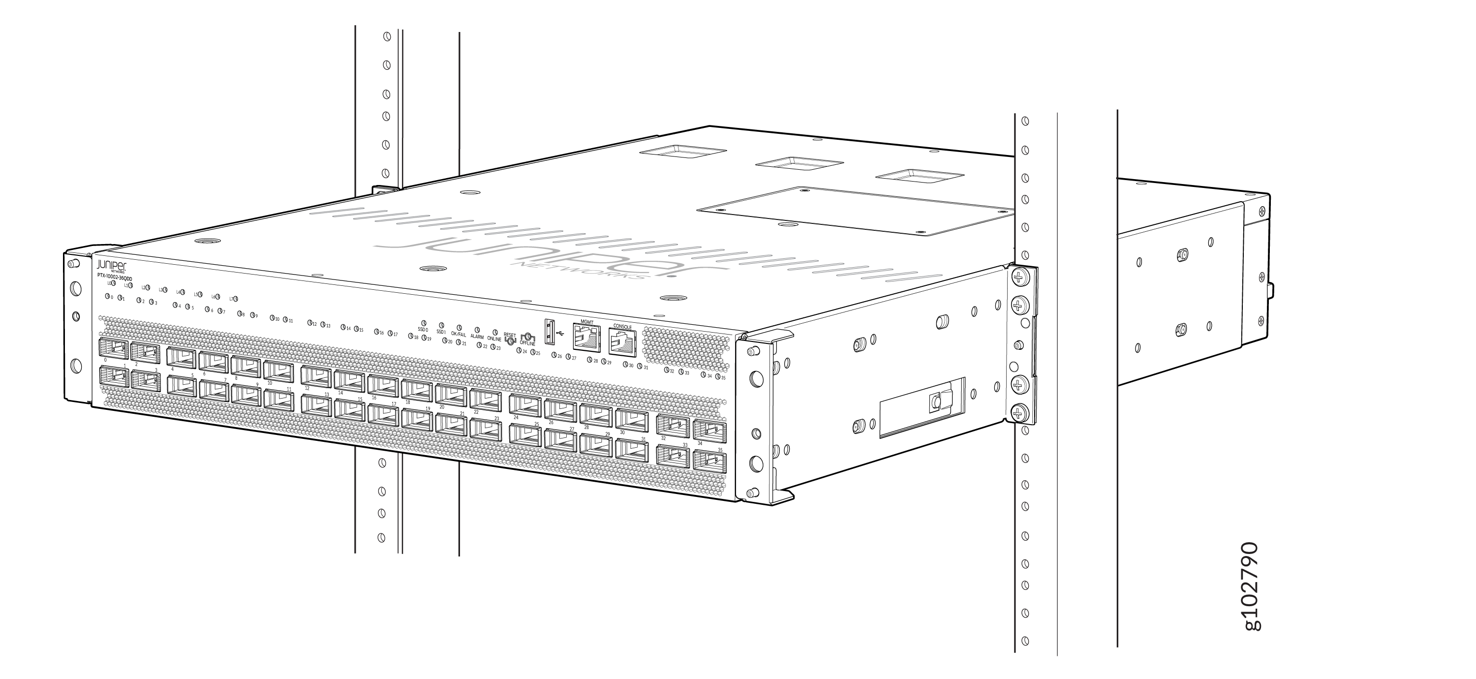Monte el PTX10002-36QDD en dos postes de un rack o gabinete
