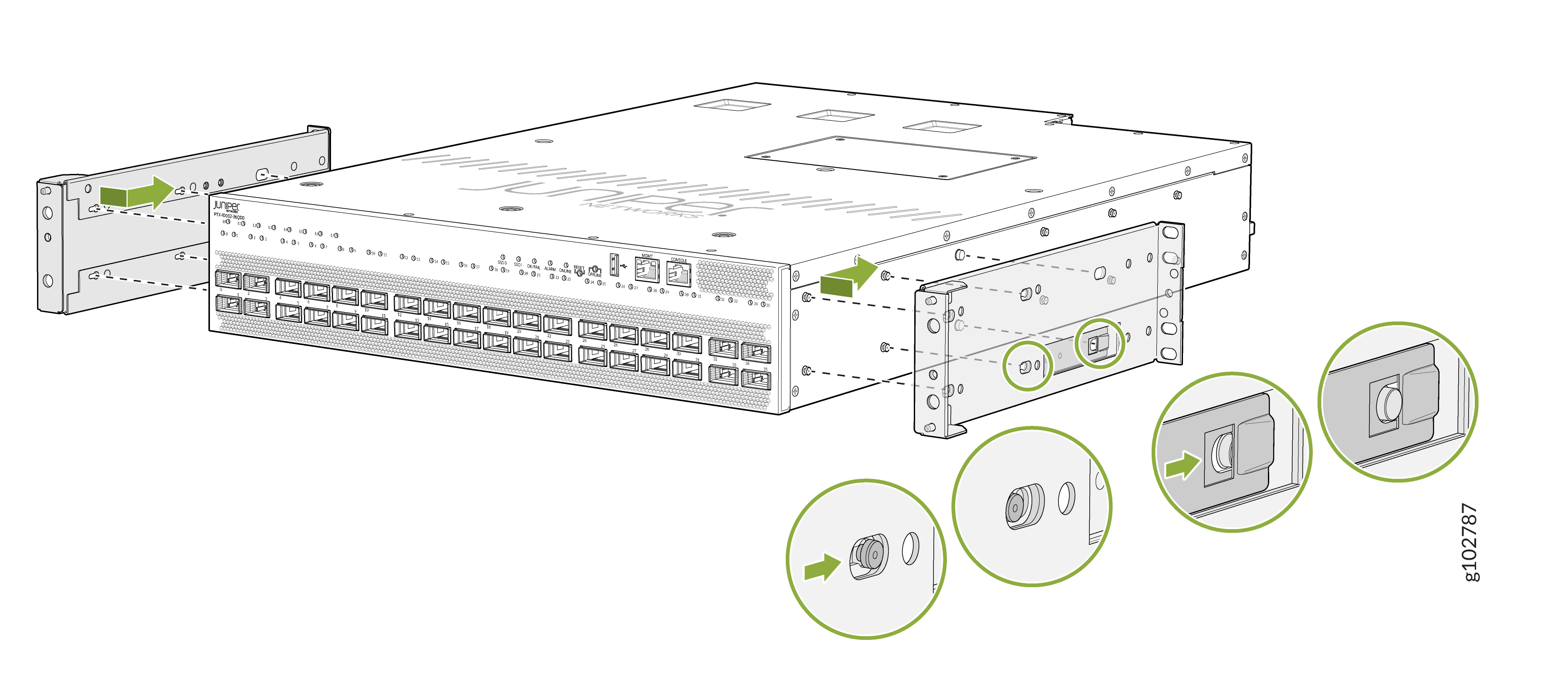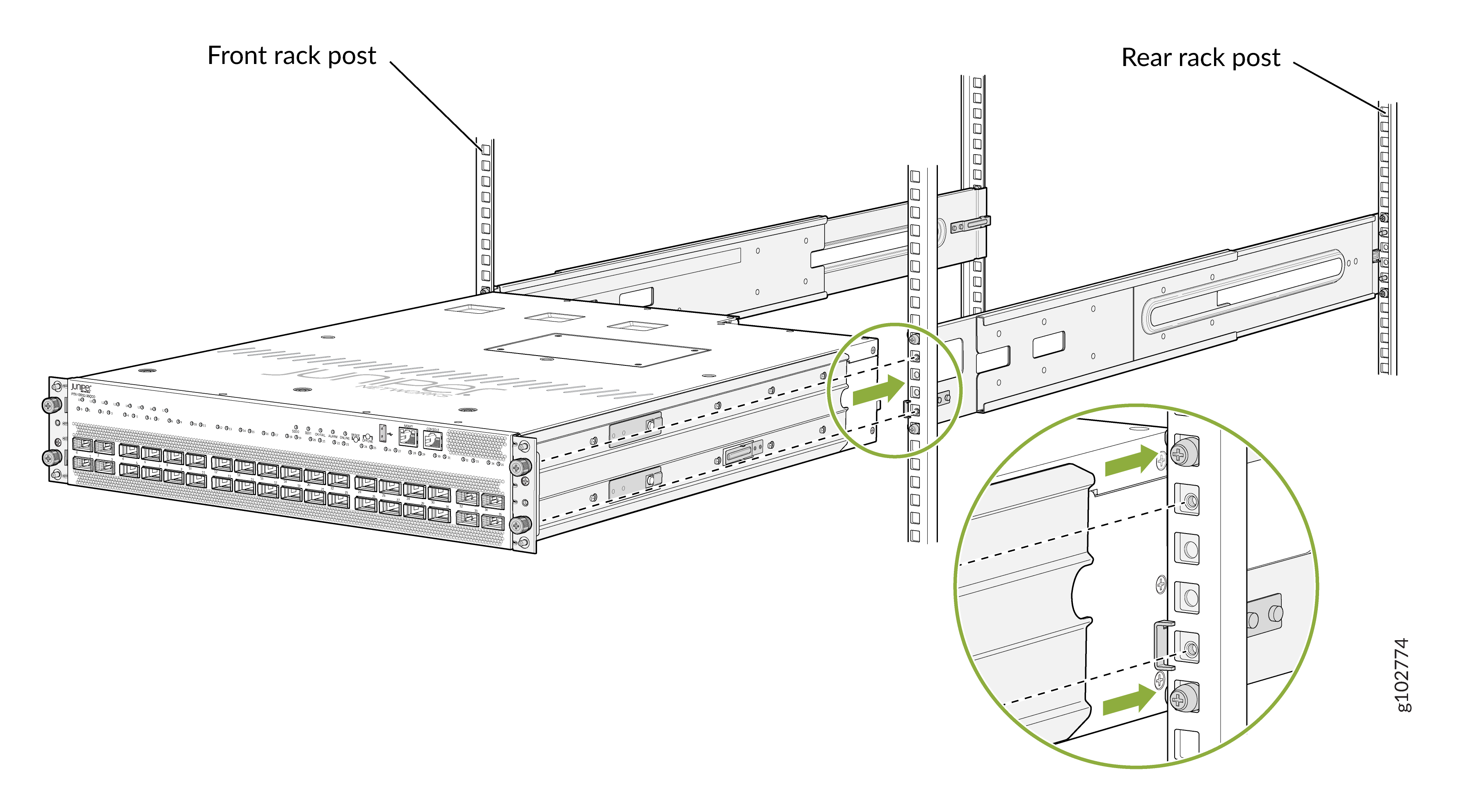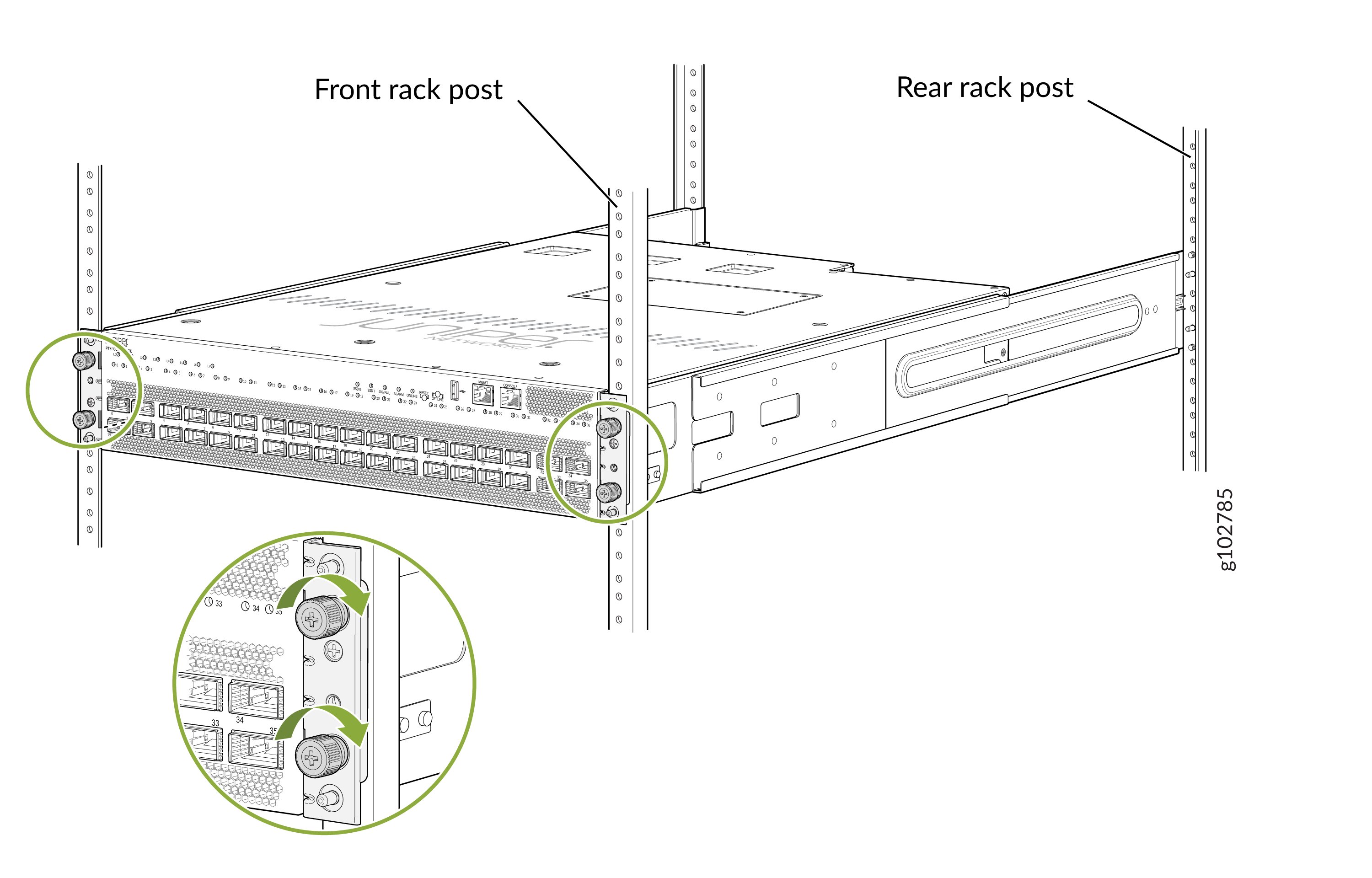 Monte el PTX10002-36QDD en dos postes de un rack o gabinete