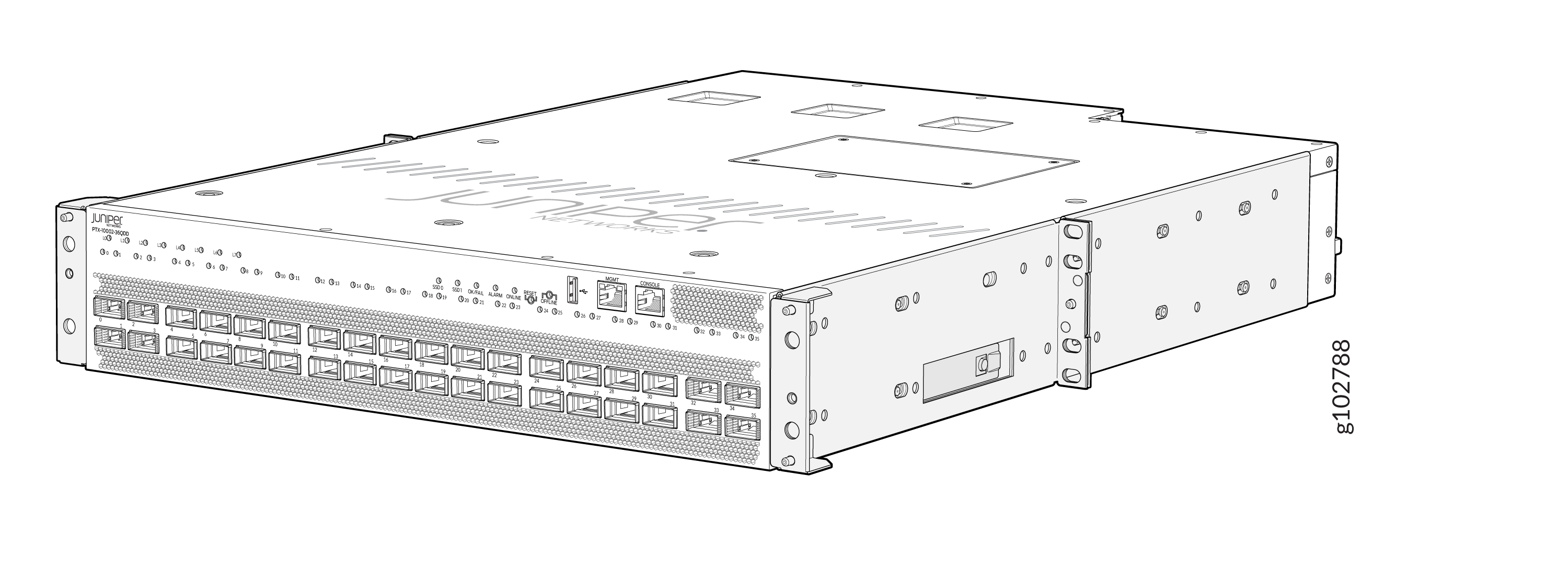 El chasis del enrutador PTX10002-36QDD es una estructura rígida de chapa metálica que alberga los componentes de hardware. Enviamos el enrutador en una caja que está asegurada a una base de palet de madera.
