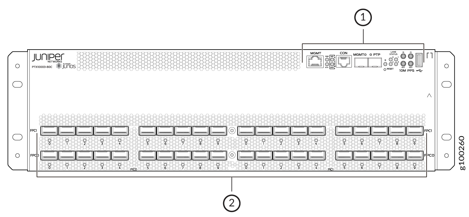El panel de administración PTX10003-8T se encuentra en la esquina superior derecha del panel de puertos (consulte la figura 1).