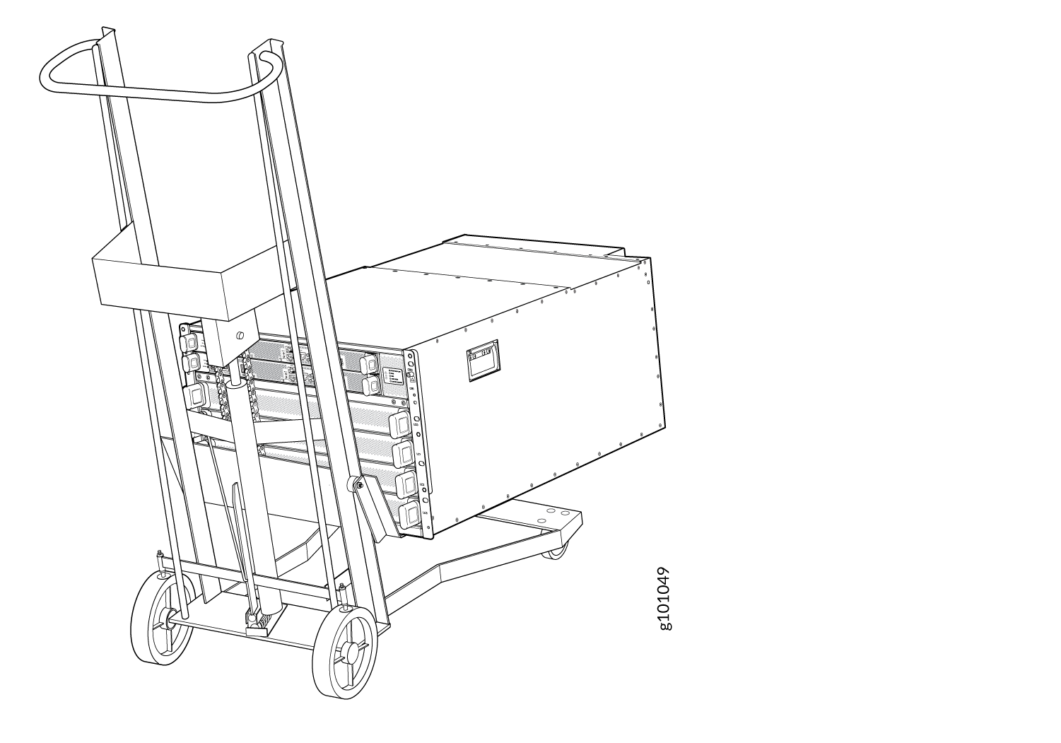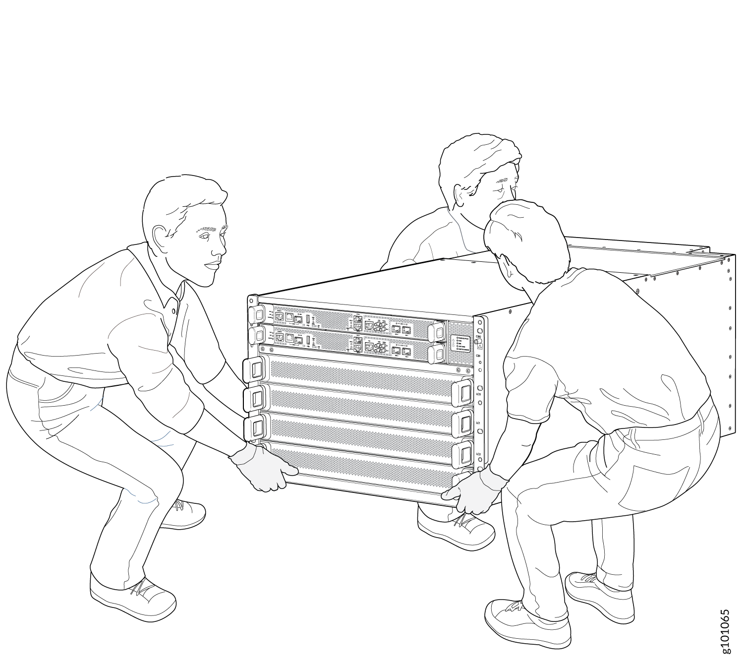 El chasis pesa aproximadamente 123 lb (56 kg) con solo los controladores de la bandeja del ventilador instalados. Debido al tamaño y peso del enrutador, le recomendamos encarecidamente que utilice un elevador mecánico para extraer el PTX10004. Levantar el chasis y sacarlo de un bastidor o gabinete requiere al menos tres personas.