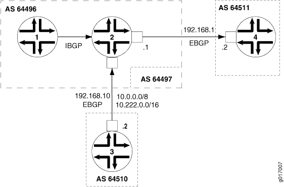privateque el AS local no se anteponga al AS global en la ruta de AS enviada a pares externos. Cuando se especifica laprivateopción, el AS local se antepone solo a la ruta del AS enviada al vecino del EBGP.Por ejemplo, en , el Figura 1enrutador 1 y el enrutador 2 están en el AS 64496, el enrutador 4 está en el AS 64511 y el enrutador 3 está en el AS 64510. El enrutador 2 antes pertenecía al AS 64497 que se fusionó con otra red y ahora pertenece al AS 64496. Dado que el enrutador 3 todavía está emparejado con el enrutador 2 mediante su AS anterior (64497), el enrutador 2 debe configurarse con un AS local de 64497 para mantener el emparejamiento con el enrutador 3. La configuración de un AS local de 64497 permite que el enrutador 2 agregue el AS 64497 cuando anuncie rutas al enrutador 3. El enrutador 3 ve una ruta de AS de 64497 64496 para el prefijo 10/8.