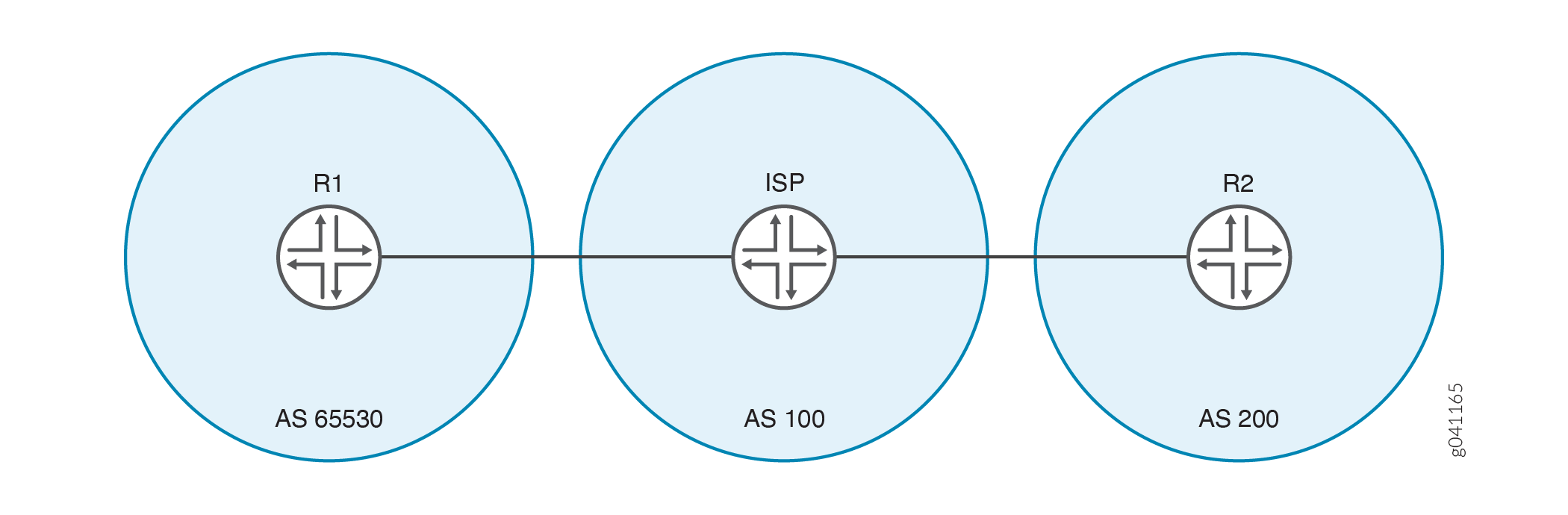 En este ejemplo, el dispositivo R1 se conecta a su proveedor de servicios mediante el número de AS privado 65530. En el ejemplo se muestra la instrucción configurada en el ISP del dispositivo para evitar que el remove-private número de AS privado del dispositivo R1 se anuncie al dispositivo R2. El dispositivo R2 solo ve el número del AS del operador de telecomunicaciones.