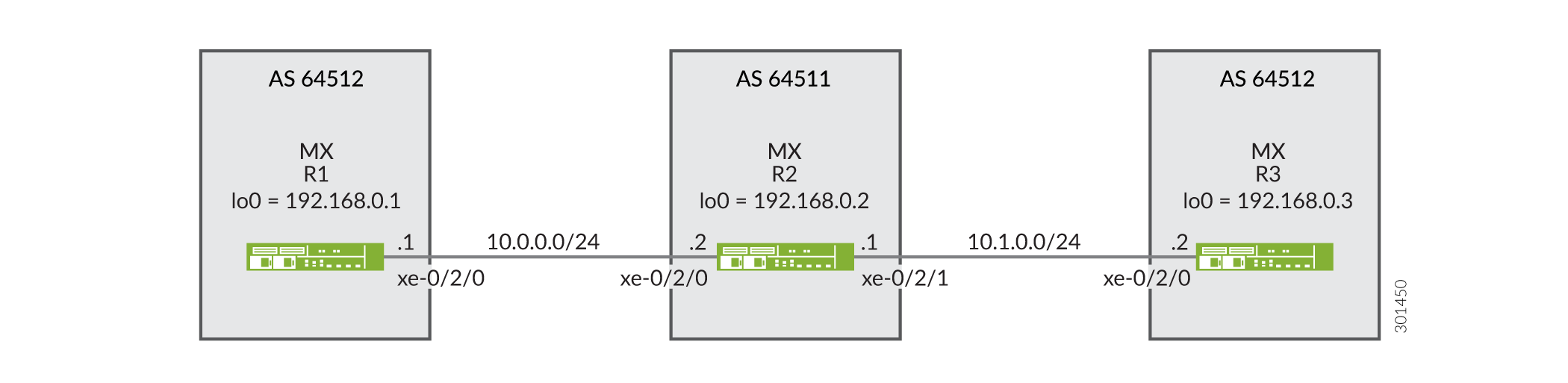 set interfaces fe-1/2/0 unit 2 family inet address 10.0.0.2/30 set interfaces fe-1/2/1 unit 3 family inet address 10.1.0.1/30 set interfaces lo0 unit 2 family inet address 192.168.0.2/32 set protocols bgp group ext type external set protocols bgp group ext export send-direct set protocols bgp group ext export send-static set protocols bgp group ext local-as 250 set protocols bgp group ext neighbor 10.0.0.1 peer-as 100 set protocols bgp group ext neighbor 10.1.0.2 peer-as 300 set policy-options policy-statement send-direct term 1 from protocol direct set policy-options policy-statement send-direct term 1 then accept set policy-options policy-statement send-static term 1 from protocol static set policy-options policy-statement send-static term 1 then accept set routing-options autonomous-system 200
