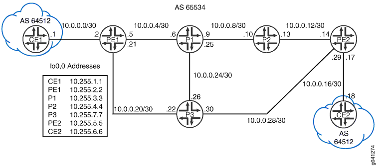 set interfaces fe-1/2/0 unit 4 family inet address 10.1.0.2/30 set interfaces lo0 unit 3 family inet address 192.168.0.3/32 set protocols bgp group ext type external set protocols bgp group ext export send-direct set protocols bgp group ext export send-static set protocols bgp group ext peer-as 250 set protocols bgp group ext neighbor 10.1.0.1 set policy-options policy-statement send-direct term 1 from protocol direct set policy-options policy-statement send-direct term 1 then accept set policy-options policy-statement send-static term 1 from protocol static set policy-options policy-statement send-static term 1 then accept set routing-options static route 10.0.0.0/30 next-hop 10.1.0.1 set routing-options autonomous-system 300