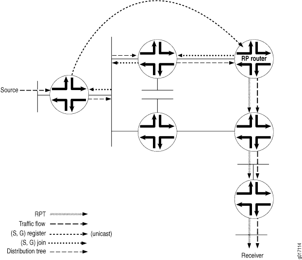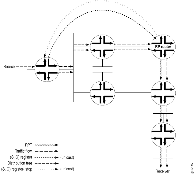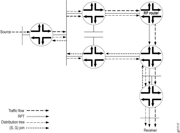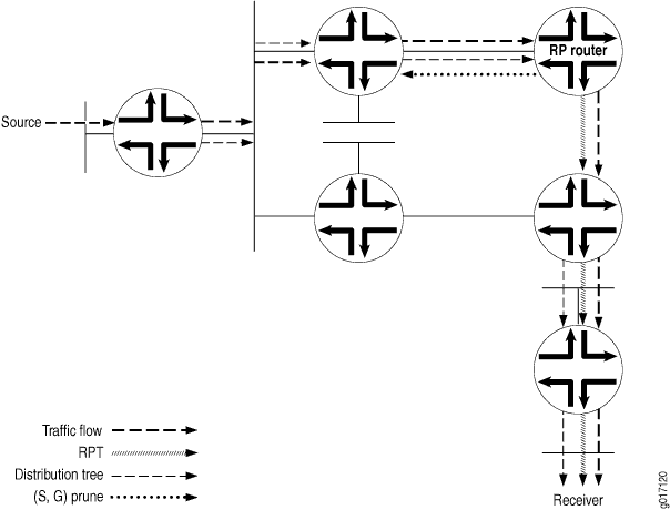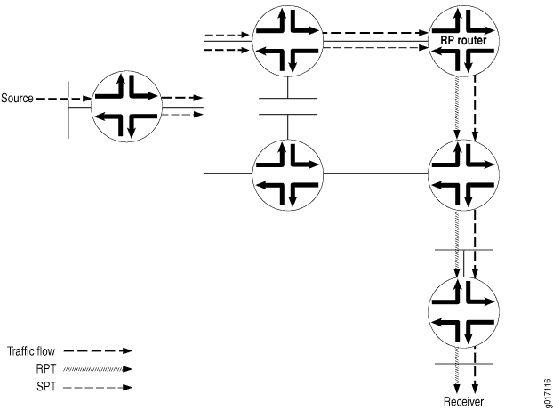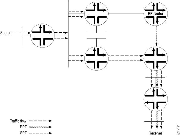 El RPT es un árbol unidireccional que permite que el tráfico fluya desde el RP al receptor en una dirección. Para que el tráfico de multidifusión llegue al receptor desde el origen, es necesario construir otra rama del árbol de distribución, denominada árbol de ruta más corta, desde el DR del origen hasta el RP.