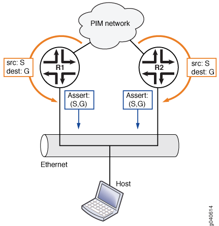 En la figura 10, los dispositivos de enrutamiento R1 y R2 reenvían paquetes de multidifusión para la misma entrada (S,G) en una red. Ambos dispositivos detectan esta situación y ambos envían mensajes de aserción en la red Ethernet. Un mensaje assert contiene, además de una dirección de origen y una dirección de grupo, una métrica de costo de unidifusión para enviar paquetes al origen y una métrica de preferencia para el costo de unidifusión. La métrica de preferencias expresa una preferencia entre protocolos de enrutamiento de unidifusión. El dispositivo de enrutamiento con la métrica de preferencia más pequeña se convierte en el reenviador (también llamado ganador de la afirmación). Si las métricas de preferencia son iguales, el dispositivo que envió la métrica de costo de unidifusión más baja se convierte en el reenviador. Si las métricas de unidifusión también son iguales, el dispositivo de enrutamiento con la dirección IP más alta se convierte en el reenviador. Después de la transmisión de mensajes de confirmación, solo el reenviador continúa reenviando mensajes en la red.