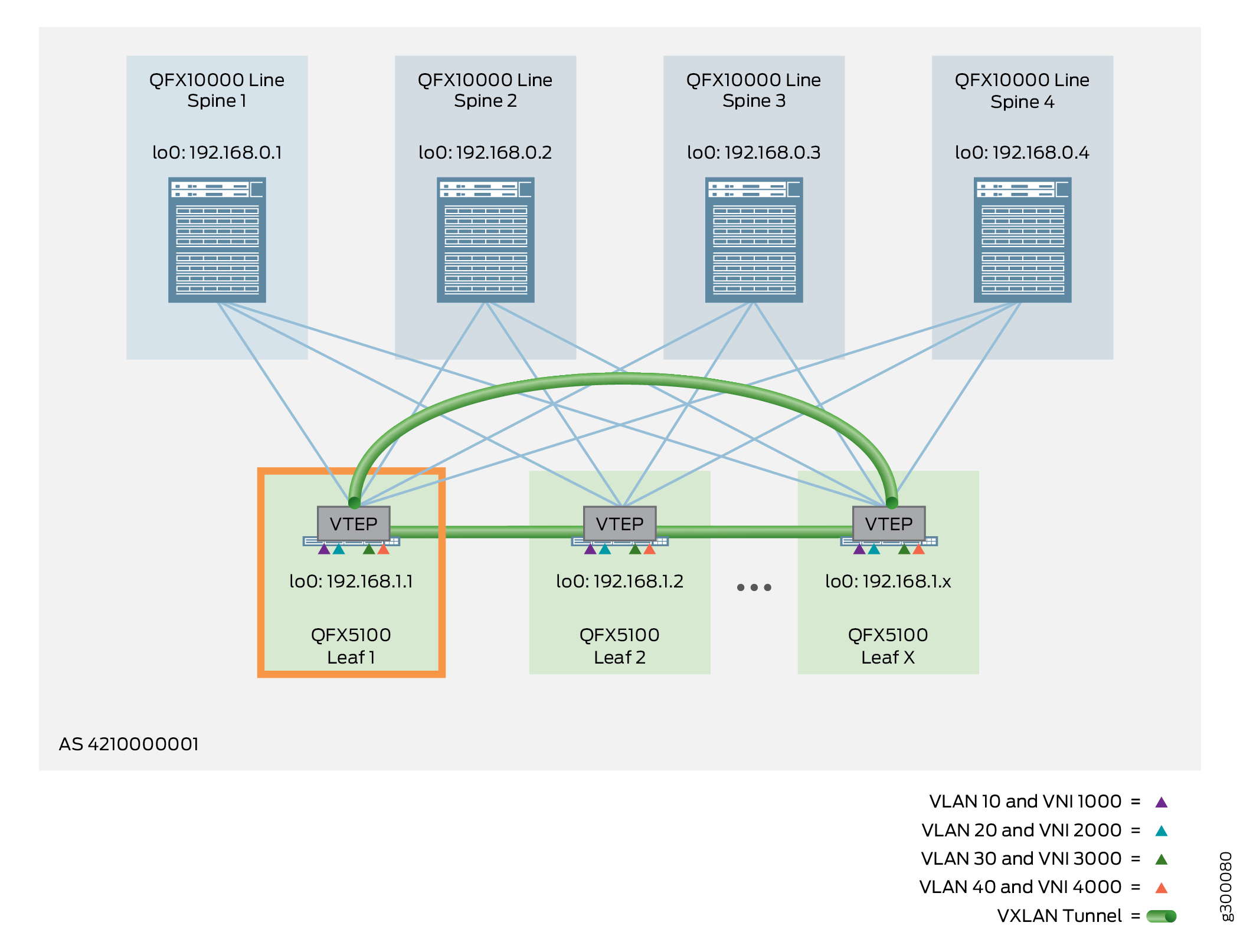 En este ejemplo, las interfaces de circuito cerrado en los dispositivos leaf actúan como extremos de túnel VXLAN (VTEP). Los túneles permiten que los dispositivos leaf envíen tráfico VLAN a otros dispositivos leaf y sistemas finales conectados a Ethernet en el centro de datos. Los dispositivos de columna vertebral solo proporcionan conectividad básica de superposición de EBGP e IBGP para estos túneles VXLAN de hoja a hoja.