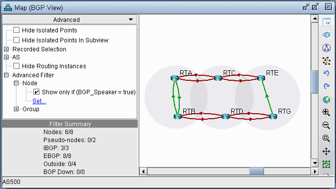 Cuando se abre el mapa BGP por primera vez, todos los enrutadores (incluidos los altavoces BGP y los que no son BGP) se muestran en el mapa BGP. Es posible que desee filtrar el mapa BGP seleccionando el menú Filtros > Avanzado. Seleccione Ocultar puntos aislados o, para ver solo los altavoces BGP, abra la sección Filtro avanzado > nodo. Haga clic en el vínculo Establecer para establecer BGP_Speaker = true. A continuación, seleccione la casilla de verificación correspondiente para activar el filtro. Las siguientes figuras muestran un mapa BGP filtrado para mostrar los altavoces BGP.