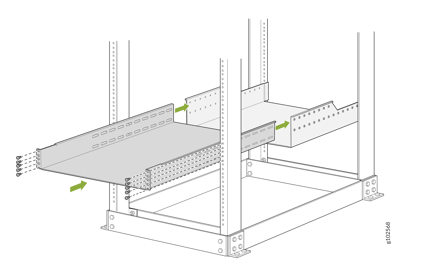 From the rear of the rack, slide the rear mounting tray into the rear posts of the rack