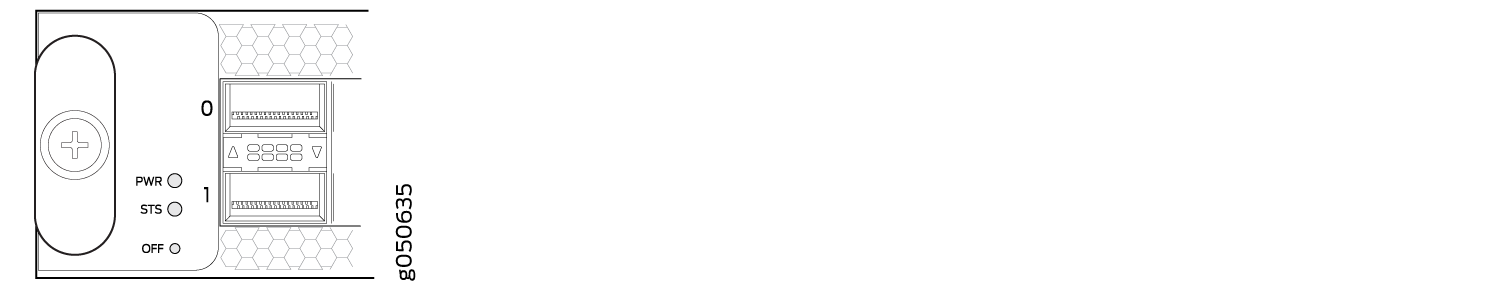 The two LEDs to the left of the network ports indicate the power (PWR) and status (STS) for the line card. See Table 6 and Table 7.