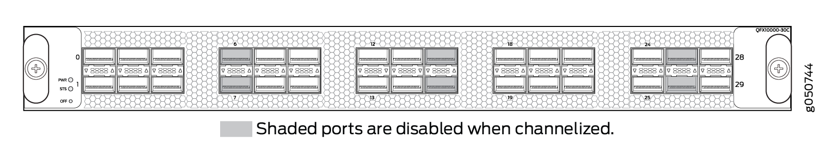 Beginning with Junos OS Release 17.1R1, 40-Gigabit Ethernet ports on the QFX10000-30C line card can be channelized to 10-Gigabit Ethernet. When ports are in channelization mode, every fourth port is disabled. See Figure 2 to see which ports are disabled and see Table 1 for the maximum port configurations.