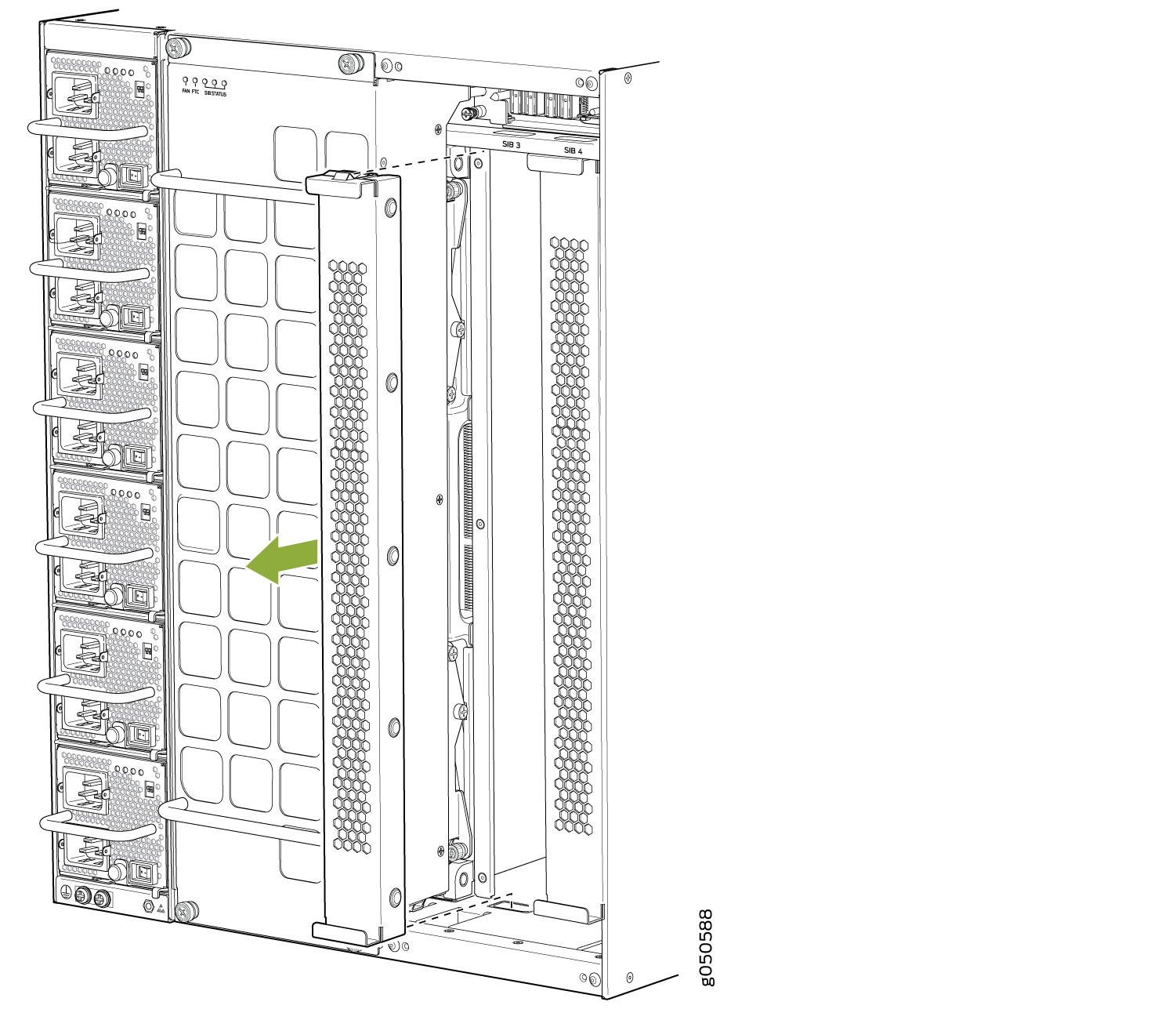 behind the fan trays. SIB 0 through SIB 2 are located behind the left fan tray and SIB 3 through SIB 5 are located behind