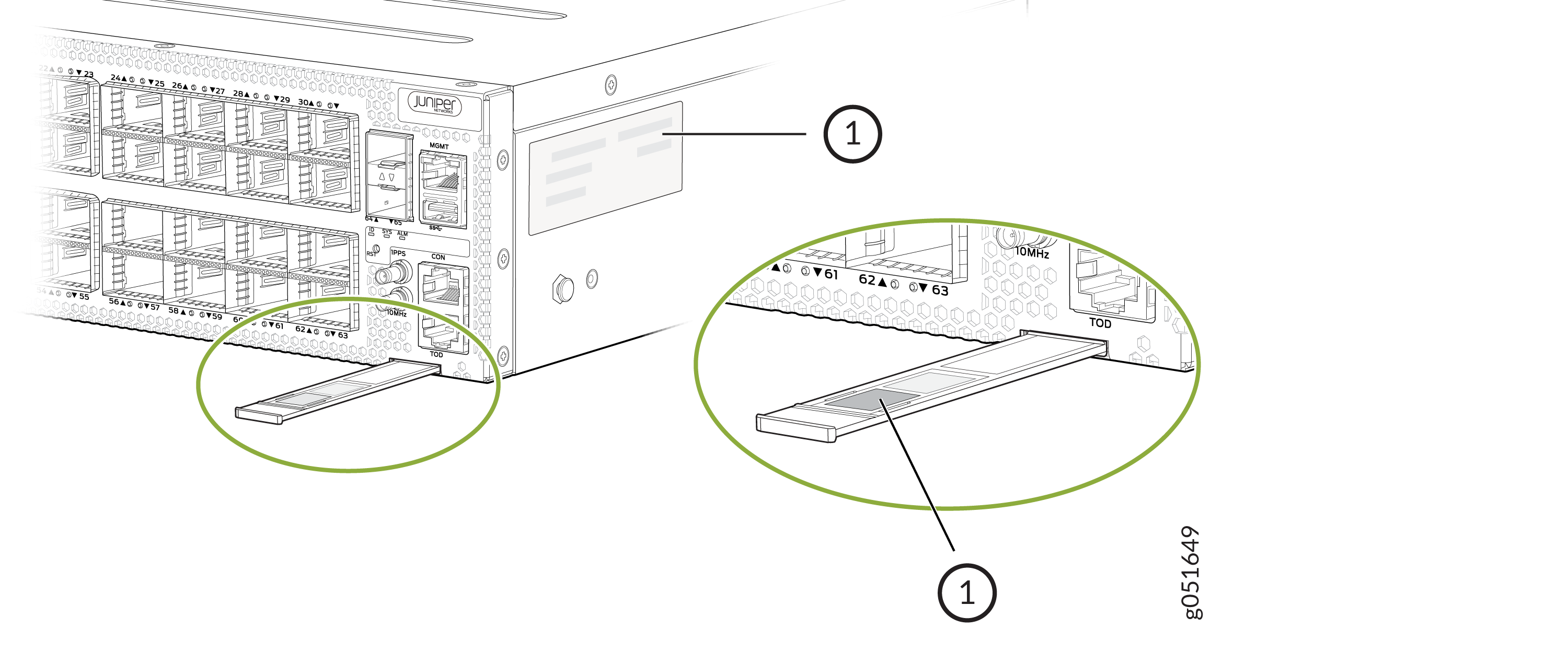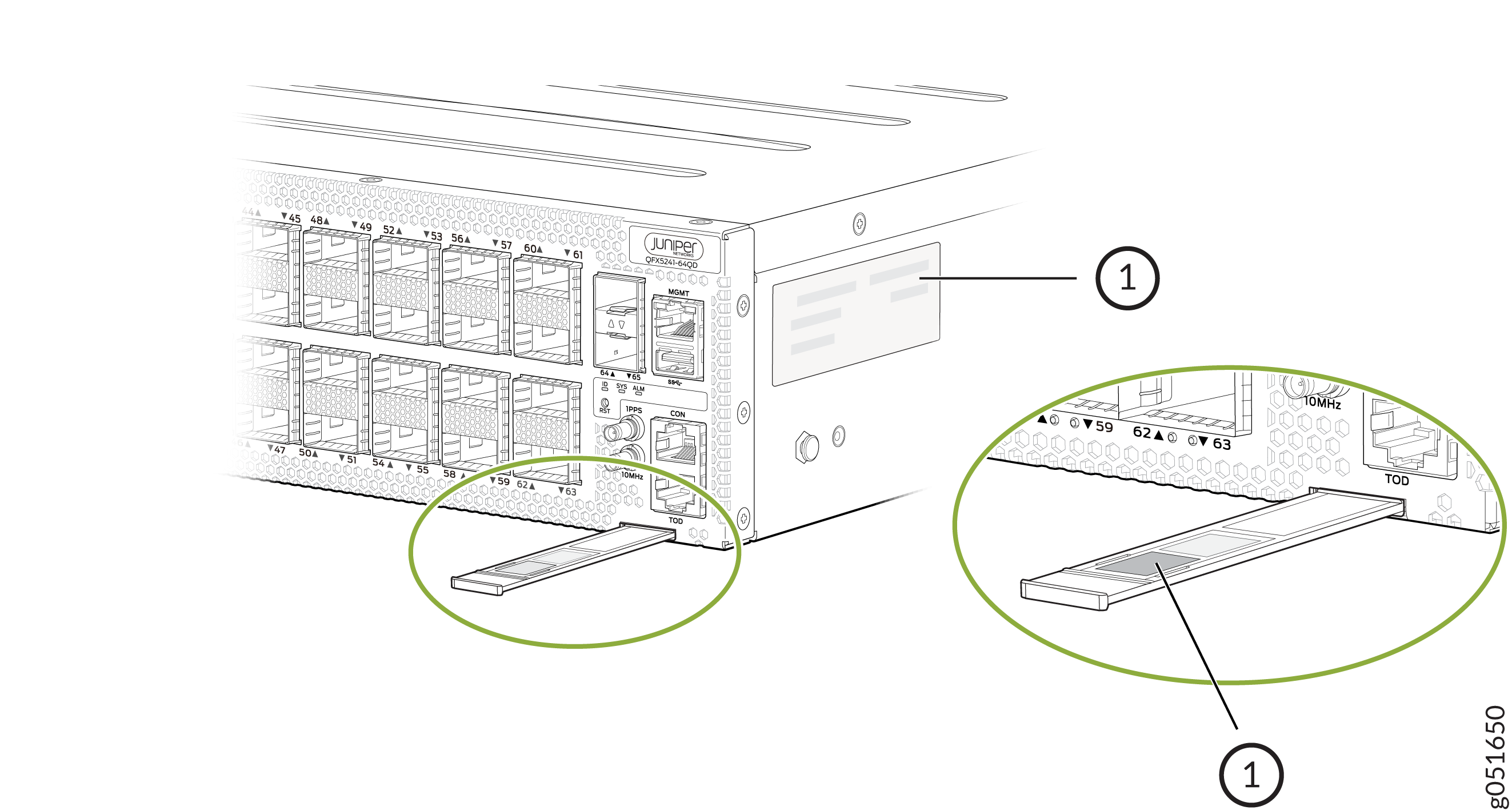 on the right side of the QFX5241-64OD or QFX5241-64QD port panel. See Figure 1 for the QFX5241-64OD switch and Figure 2 for the QFX5241-64QD switch.