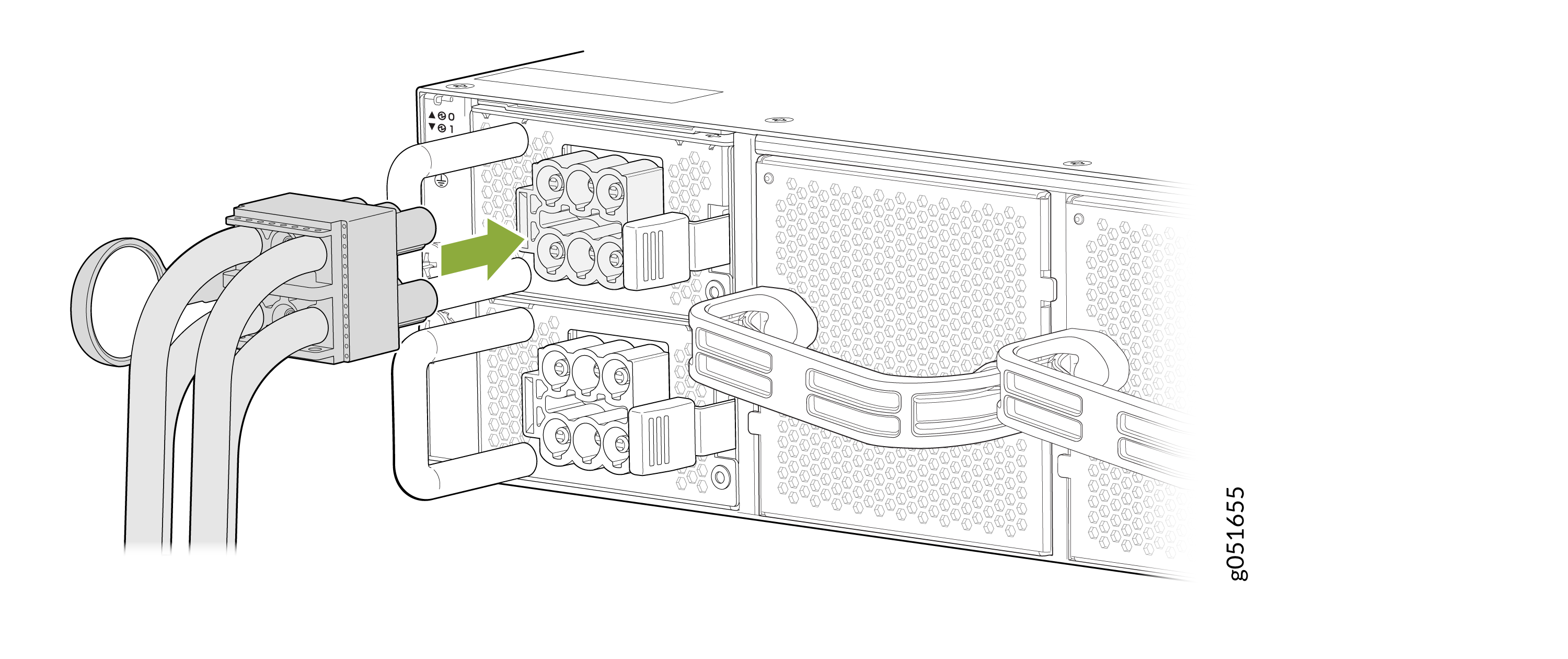 Install the PSUs in the chassis. For instructions on installing DC PSUs in the QFX5241-64OD and QFX5241-64QD switches, see Install a Power Supply Unit in QFX5241-64OD and QFX5241-64QD Switches.