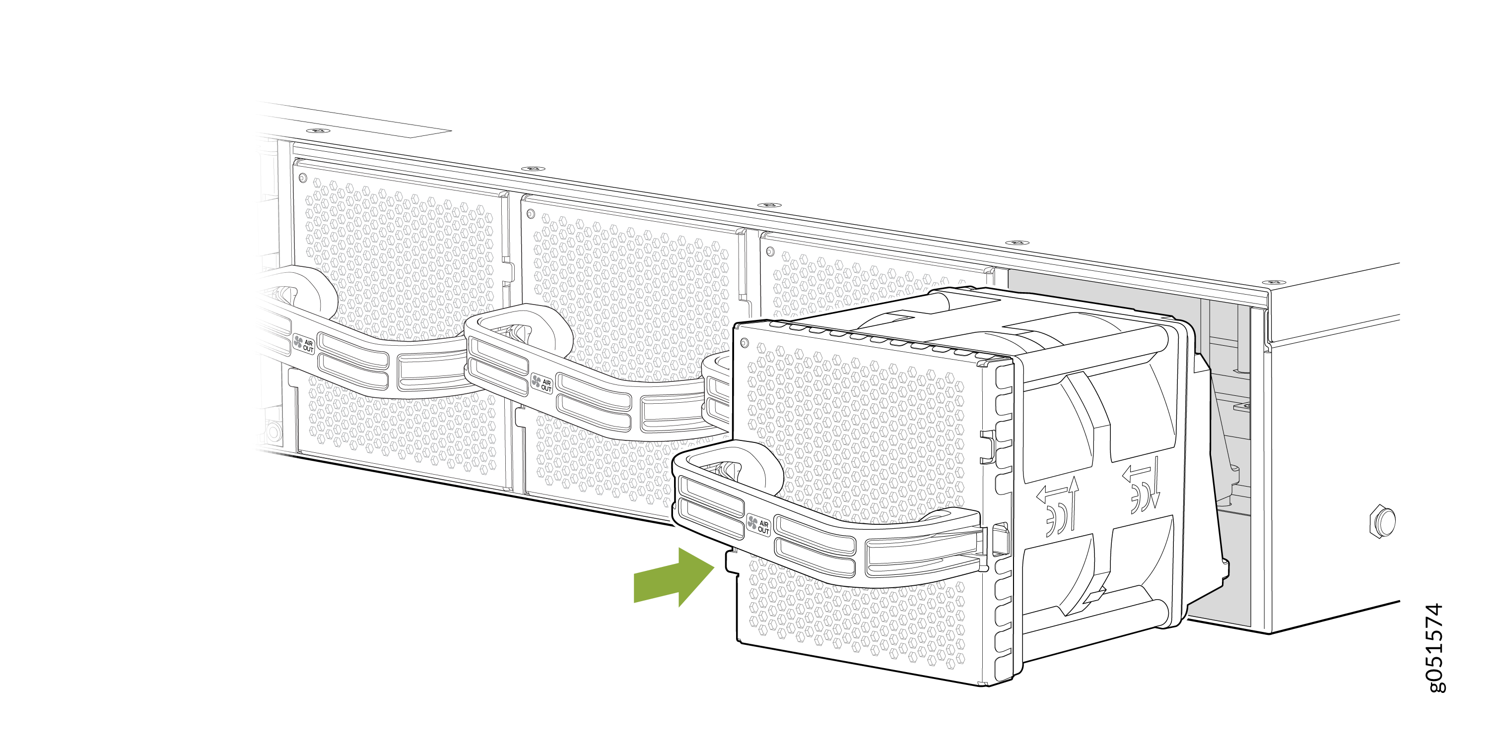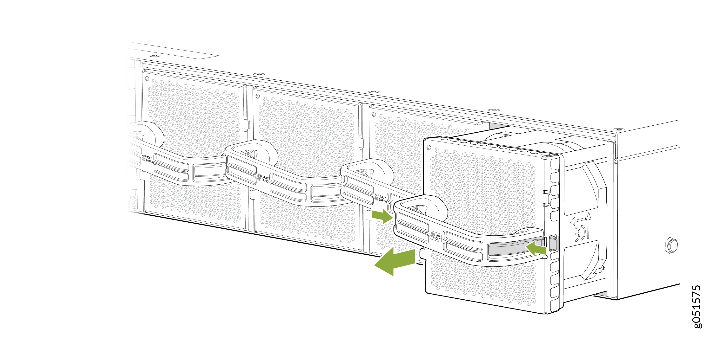 To ensure proper airflow, keep a failed fan module in place until you have a replacement fan module at hand. Do not run the device with an open fan tray slot for an extended amount of time.