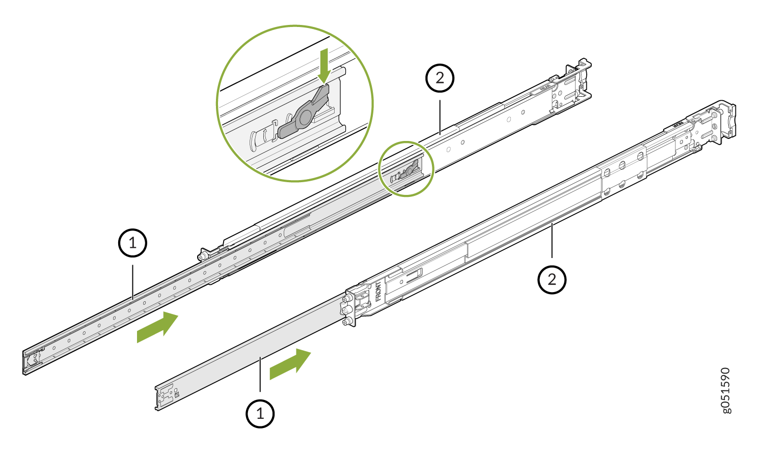 Move the latch on the rear end of the rail assembly to the open position.