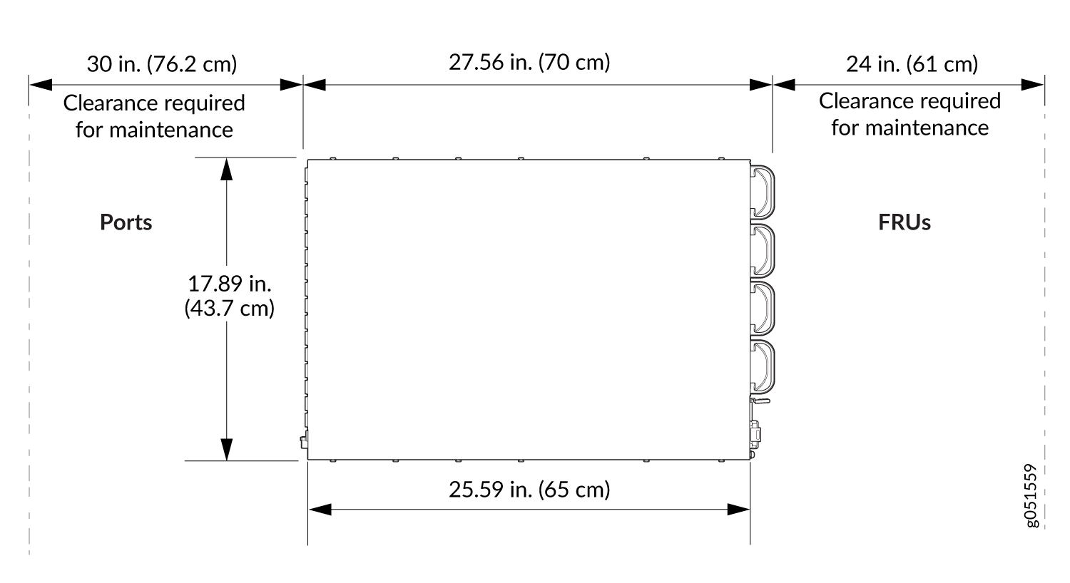 When planning the site for installing the QFX5241-64OD and QFX5241-64QD switches, you must allow sufficient clearance around the installed chassis (see Figure 2).