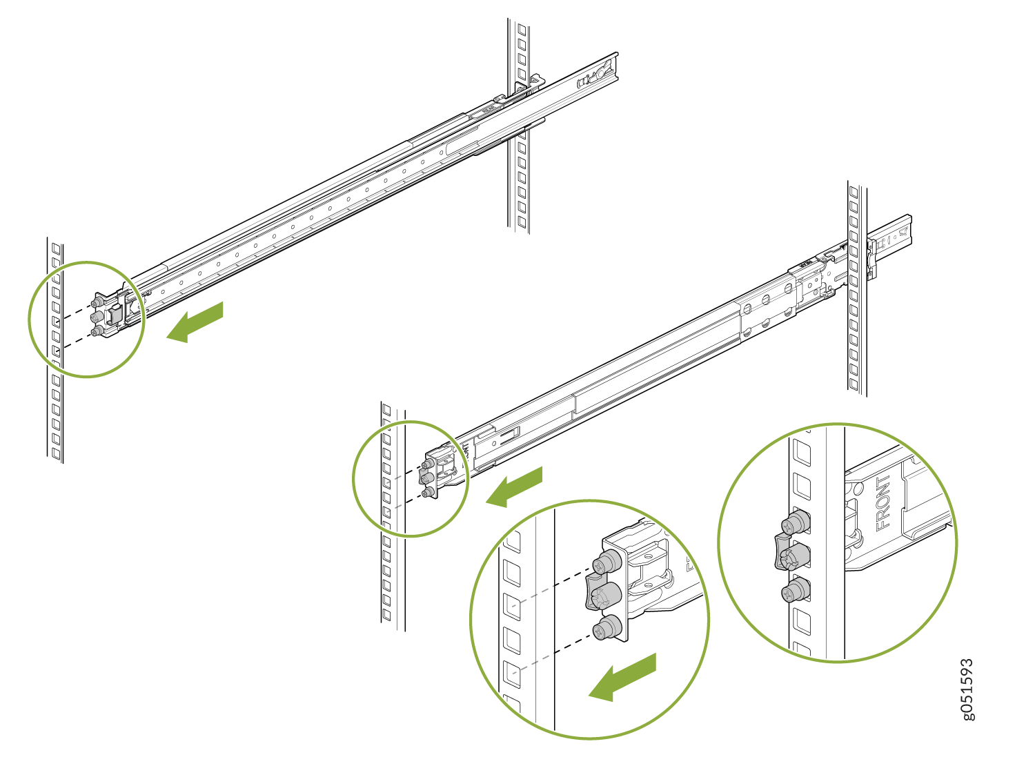 Adjust the slider rail length and push the front-mounting pegs on it into the front rack-post holes. You will hear a click.