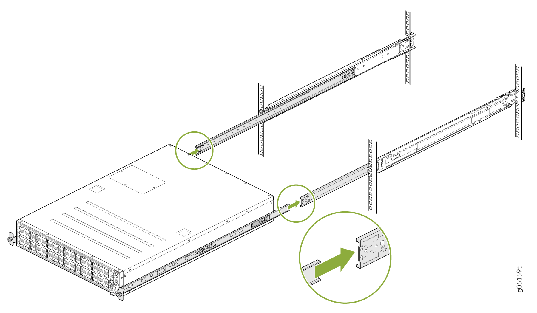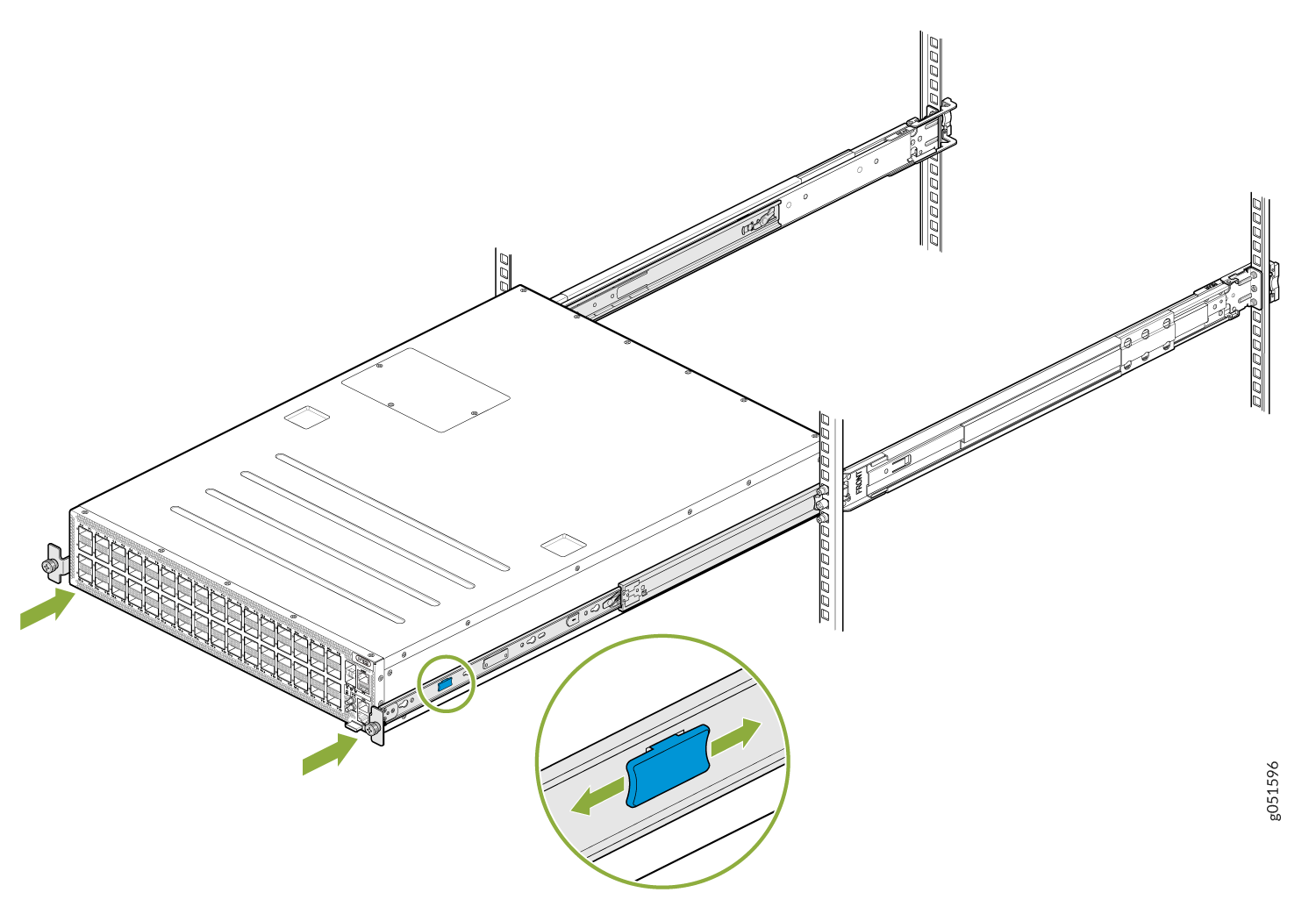 Lift the switch and align the rear of the inner rail brackets with the front ends of the slider rails on the rack.