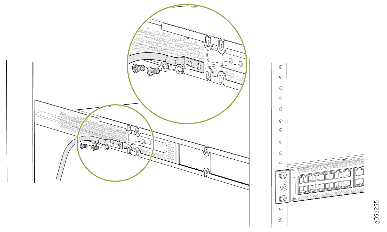 Two 10-32 x .25-in. screws with #10 split-lock washers to secure the grounding lug