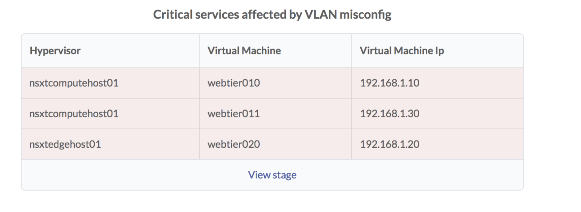 NSX-T Integration - VMs participating in a particular network are attached to an NSX logical switch. In NSX transport zone controls to which hypervisors or ESXi host an NSX logical switch can span. To have VXLAN connectivity for these VMs they need to be part of the same transport zone. This predefined anomaly helps validate that all VLAN backend interfaces defined for NSX-T nodes are also configured on the ToR interfaces connecting that node to the fabric. VLAN probe anomaly checks for VLAN specification in case of NSX-T via one of the two methods below: Method One: When you have VMs that are connected to the NSX-T overlay, you can configure a bridge-backed logical switch to provide layer 2 connectivity with other devices or VMs. So via VLAN specification on NSX-T layer 2 bridges and fabric if respective VXLAN VN is not there, then an anomaly is raised. Method Two: Edge uplinks go out through VLAN logical switches. So let's say if the uplink VLAN logical switch has a particular VLAN ID and respective VLAN on ToR port connected to the hypervisor host is not configured then also this VLAN probe will raise anomalies and help detect such misconfiguration. The following is a simple topology where nsxcompute_001_server_001 and