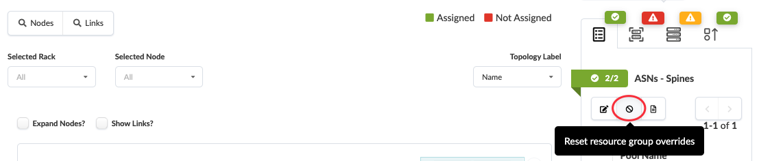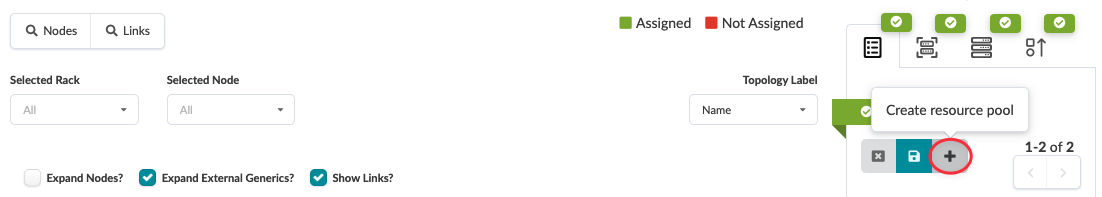 Note:If not enough resources are available, you can create a resource pool directly from the blueprint instead of navigating to the Resources catalog (new in Apstra version 5.0.0). After clicking the Update assignments button, click the Create resource pool button (the plus sign), enter the details for the pool, then click Create. You can then select the check box for the new pool to use for assigning resources.