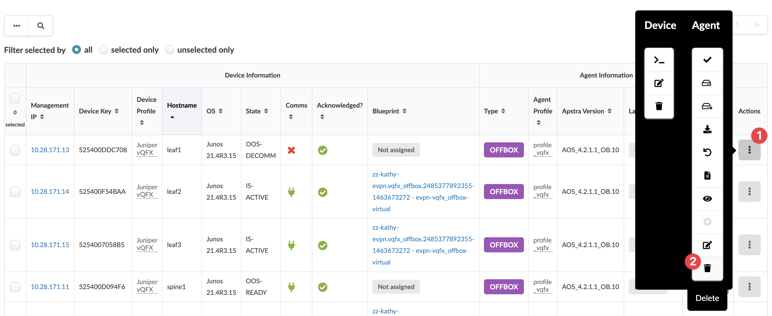 - Click the Delete button to remove the device from Apstra management and return to the Managed Devices table. (If the device is not in STOCKED or DECOMM stage, you can't delete the device.) Device(s) are disconnected from the Apstra server and removed from the Apstra database.