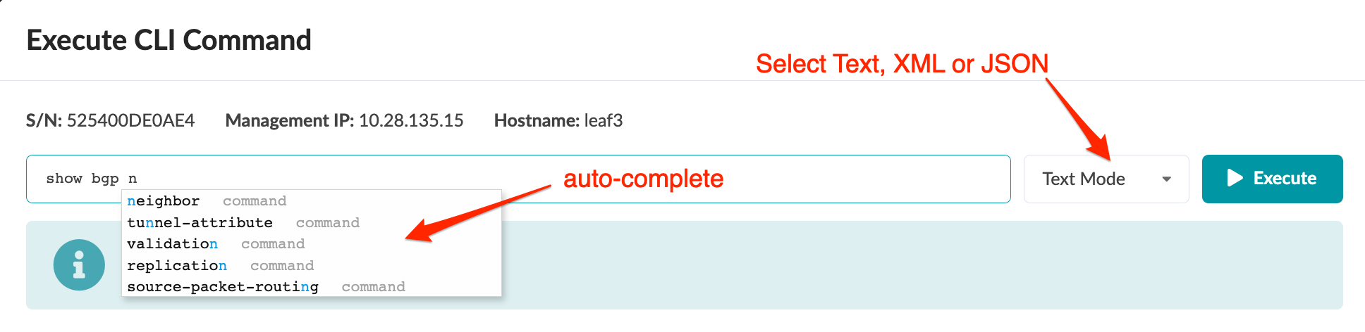While in the Apstra environment, you may need device information that's obtained via CLI commands. Traditionally, you need to log in to a machine with access to the device management network, open a terminal, find device IP addresses, SSH to each of them, then run the required CLI commands. You can bypass these steps and run show commands for Juniper devices directly from the Apstra GUI. You can execute CLI commands from within the staged or active blueprint, or from the Managed Devices page. The steps below are for Datacenter blueprints.