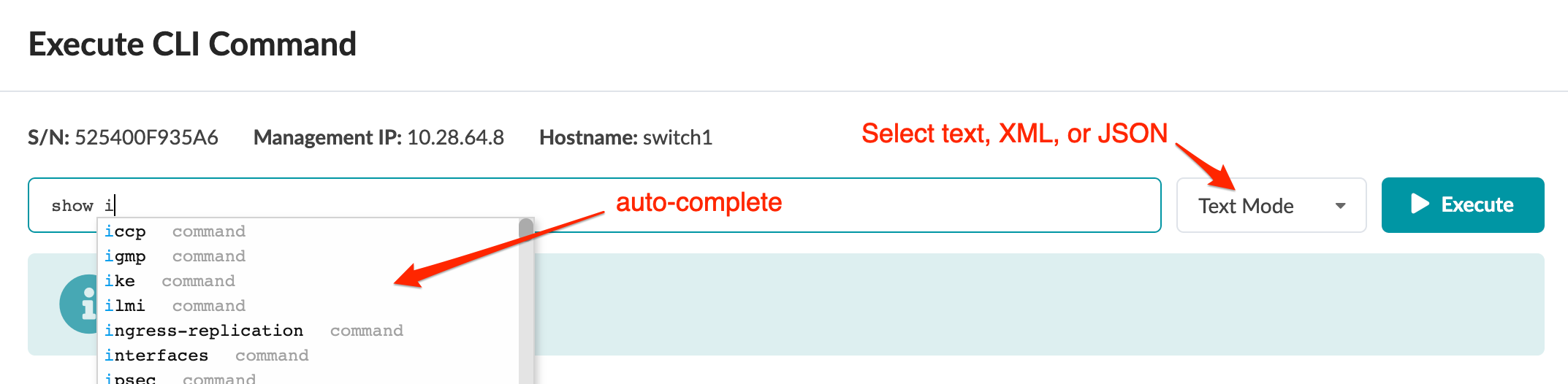 While in the Apstra environment, you may need device information that's obtained via CLI commands. Traditionally, you need to log in to a machine with access to the device management network, open a terminal, find device IP addresses, SSH to each of them, then run the required CLI commands. You can bypass these steps and run show commands for Juniper devices directly from the Apstra GUI. You can execute CLI commands from within the staged or active blueprint, or from the Managed Devices page. The steps below are for Freeform blueprints.