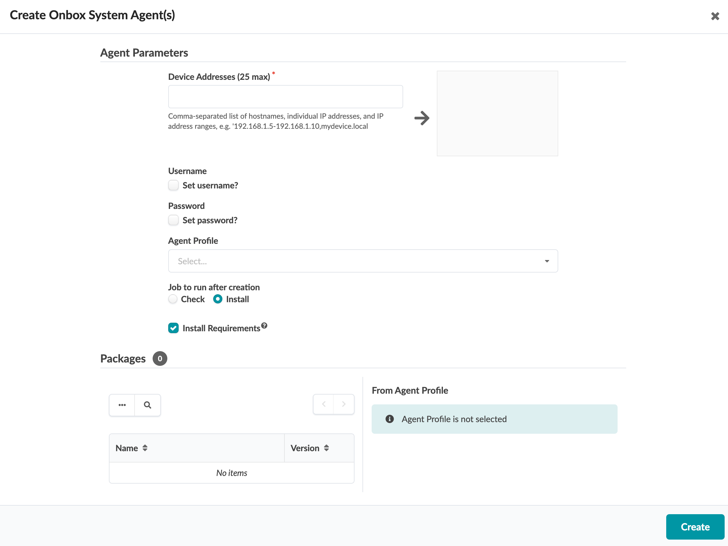 - If you are using agent profiles (that you previously defined), select the agent profile from the Agent Profile drop-down list, so you don't have to manually enter credentials and packages.