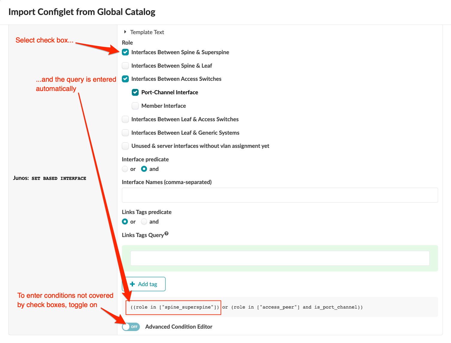 conditions for applying the configlet. Select check boxes for one or more interface roles,