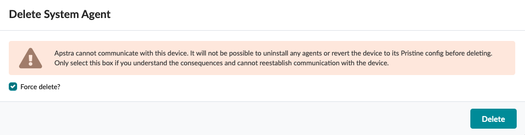 If the device is unreachable, the dialog includes a warning with the option to force delete the agent. If you decide to force delete, check the Force delete check box, then click Delete to force delete the agent and return to the table view.
