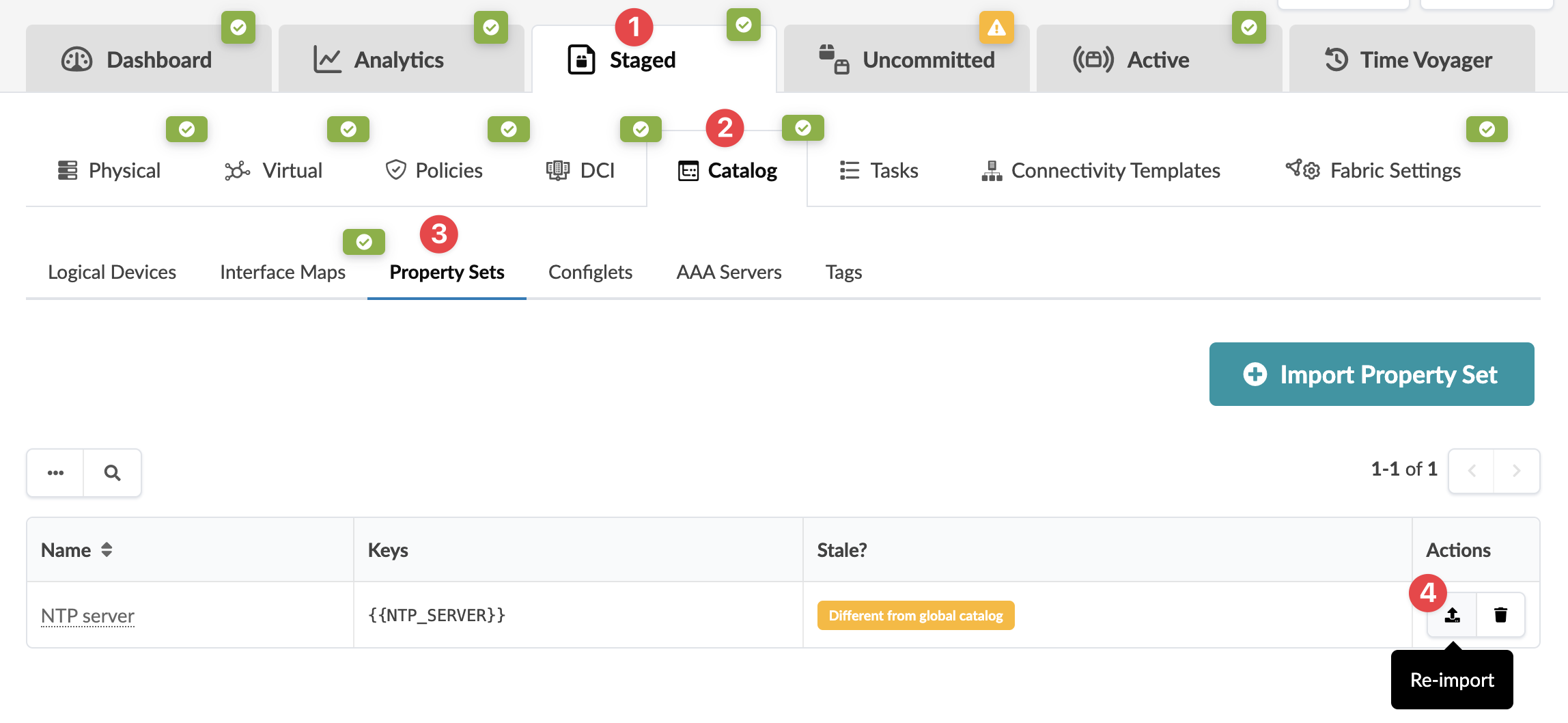 To re-import a property set into a blueprint from Apstra GUI: