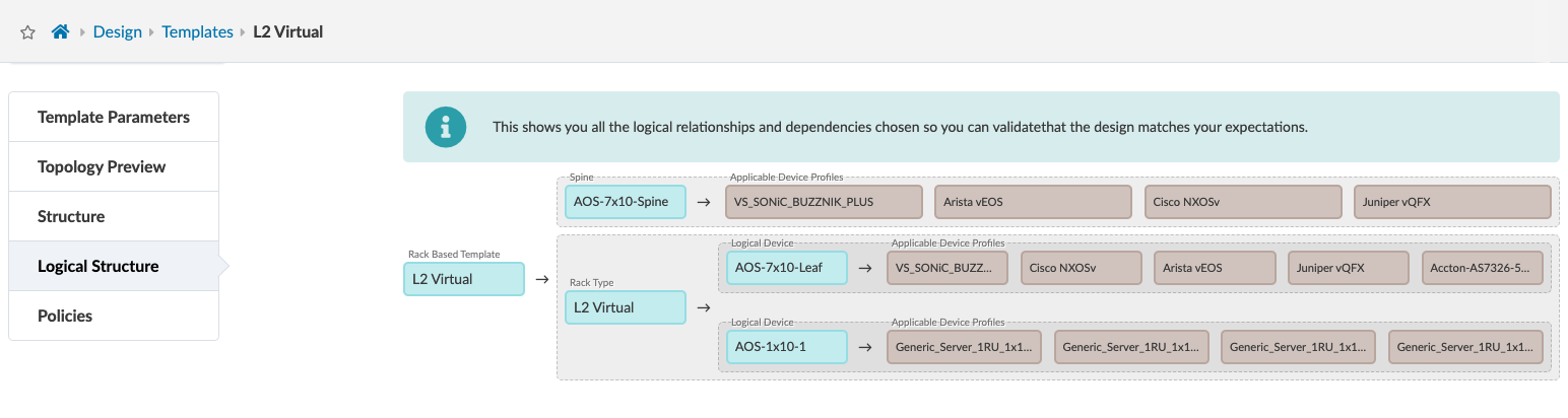 The Logical Structure section consists of a visual representation of the logical elements in the template. It shows the logical relationships and dependencies so you can validate that the design matches your expectations. The screenshot below is for the predefined rack-based rack type named L2 Virtual. In the screenshot, you can see that for the AOS-7x10-Leaf logical device, you could use one of 5 different devices. These associations are the interface maps that use that leaf logical device. If you created a new interface map that included the AOS-7x10-Leaf logical device and a different device profile, it would also appear in this logical structure graphic.