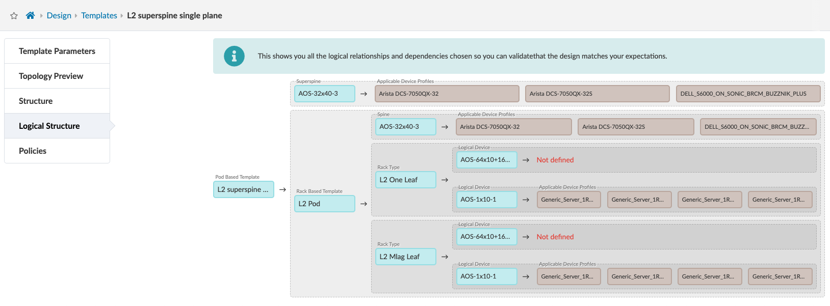 The Logical Structure section consists of a visual representation of the logical elements in the template. It shows the logical relationships and dependencies so you can validate that the design matches your expectations. The screenshot below is for the predefined pod-based rack type named L2 superspine single plane.