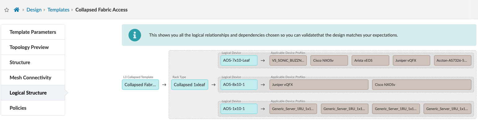 The Logical Structure section consists of a visual representation of the logical elements in the template. It shows the logical relationships and dependencies so you can validate that the design matches your expectations. The screenshot below is for the predefined collapsed rack type named Collapsed Fabric Access.
