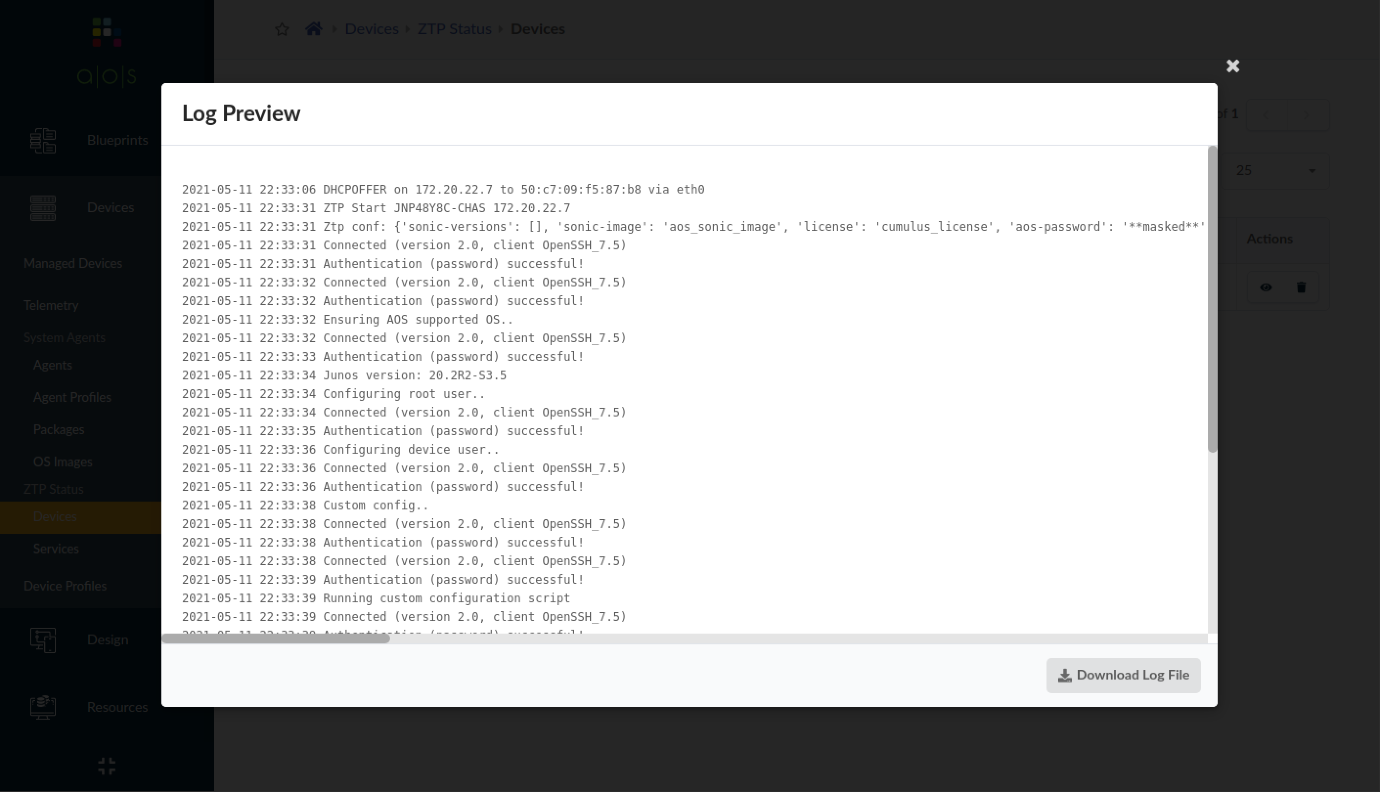 status was last updated. To see the full DHCP and ZTP log for the device, click the "Show