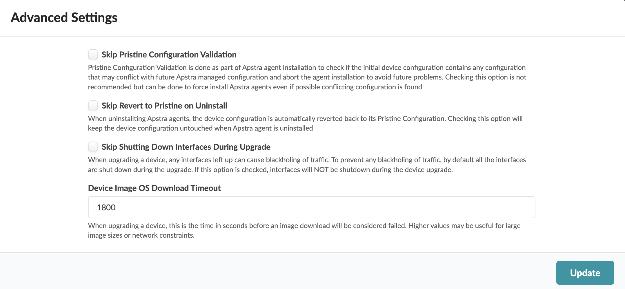 If you must complete the agent installation with configuration validation errors, you can disable pristine configuration validation. To do this, from Devices > Managed Devices, click Advanced Settings (top-right), select Skip Pristine Configuration Validation, then click Update.