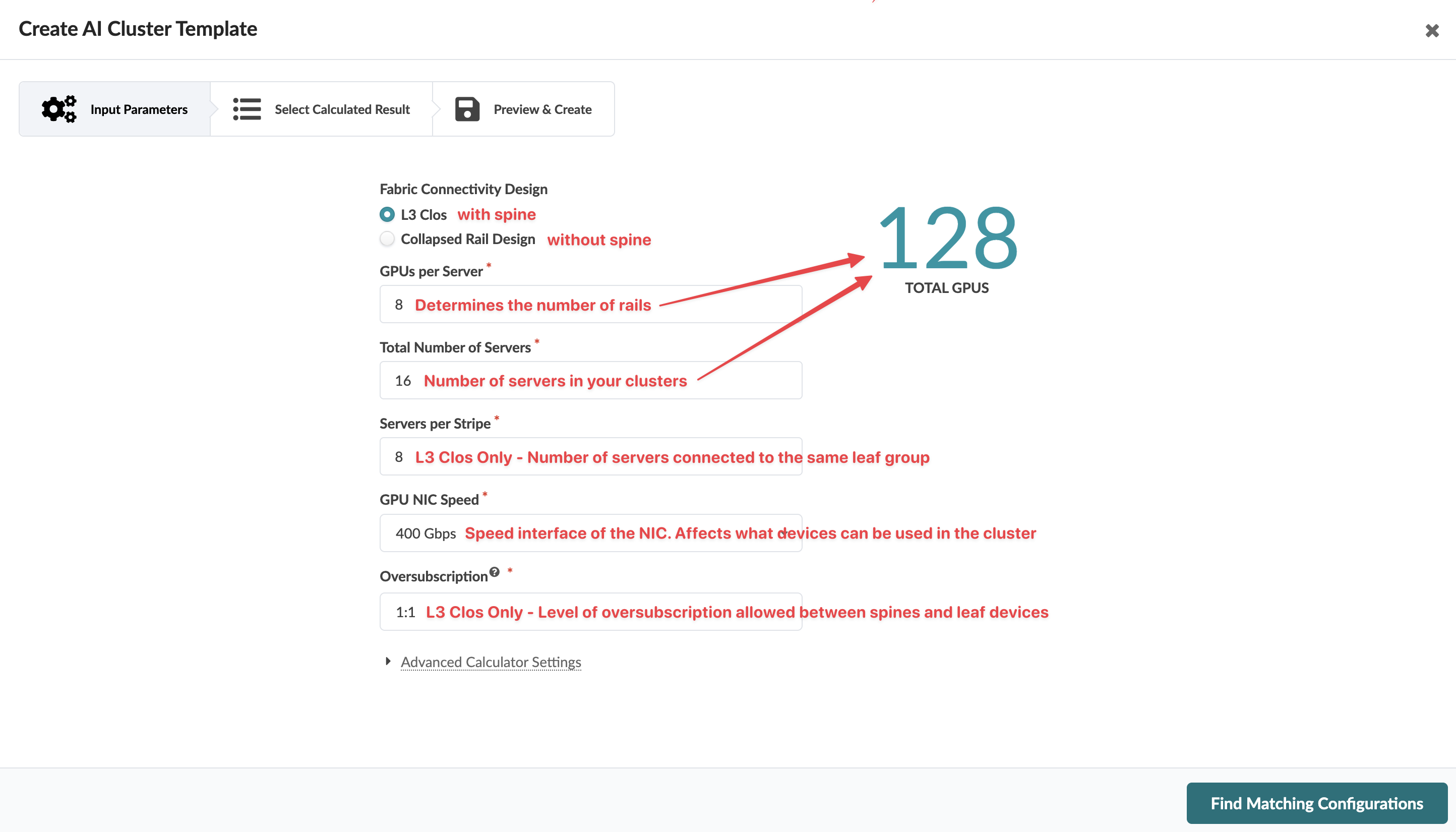 Enter the total number of servers to include. Changing the number of servers automatically changes the total number of GPUs (the big number on the right).