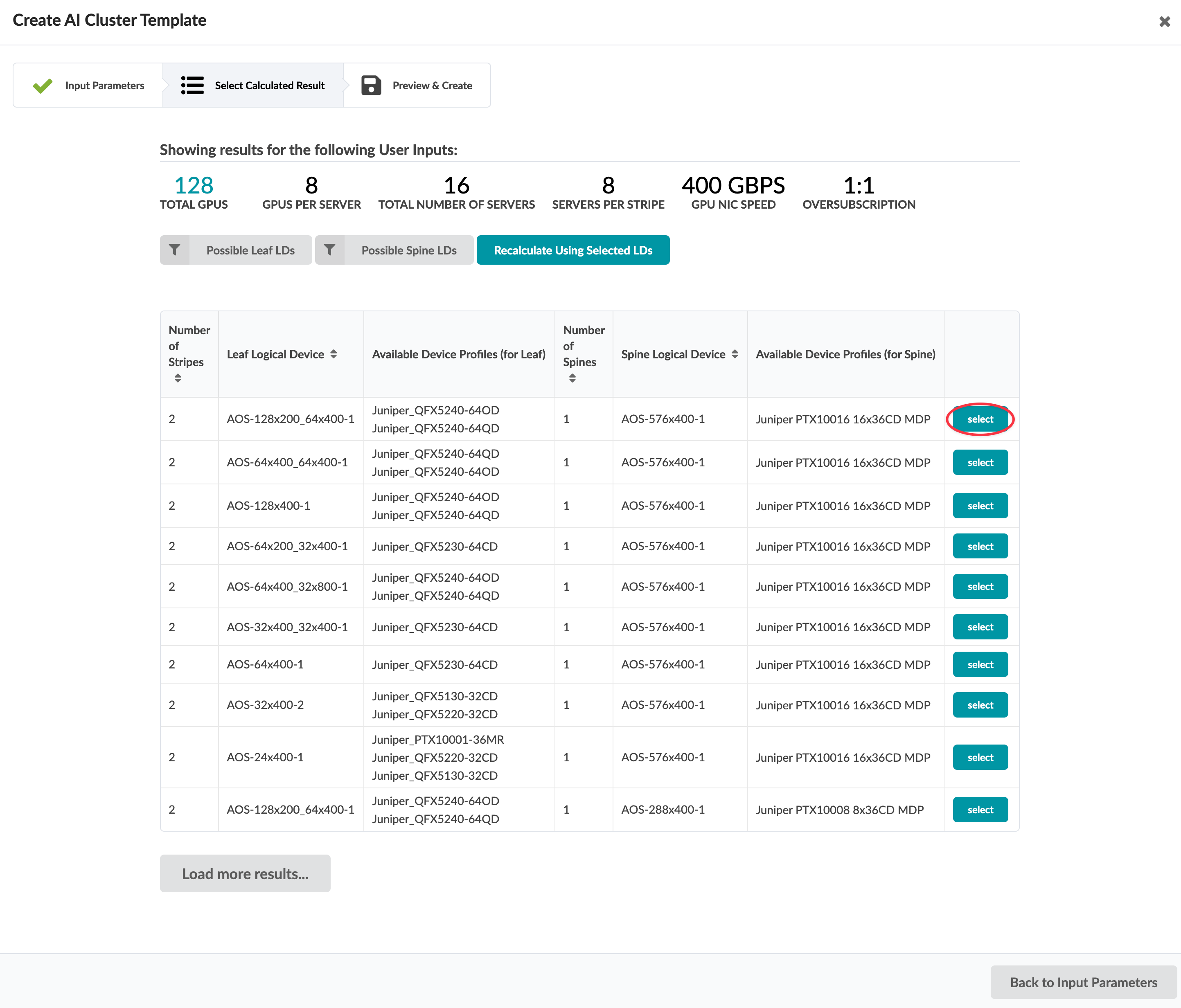 The tables often have many proposals. You can filter the results based on leaf and/or spine logical devices. For example, you may decide to select only leaf logical devices with 400G interfaces excluding those with 200G. Or, you may want to select spines that are fixed-form factors only while excluding those where the port count indicates chassis.