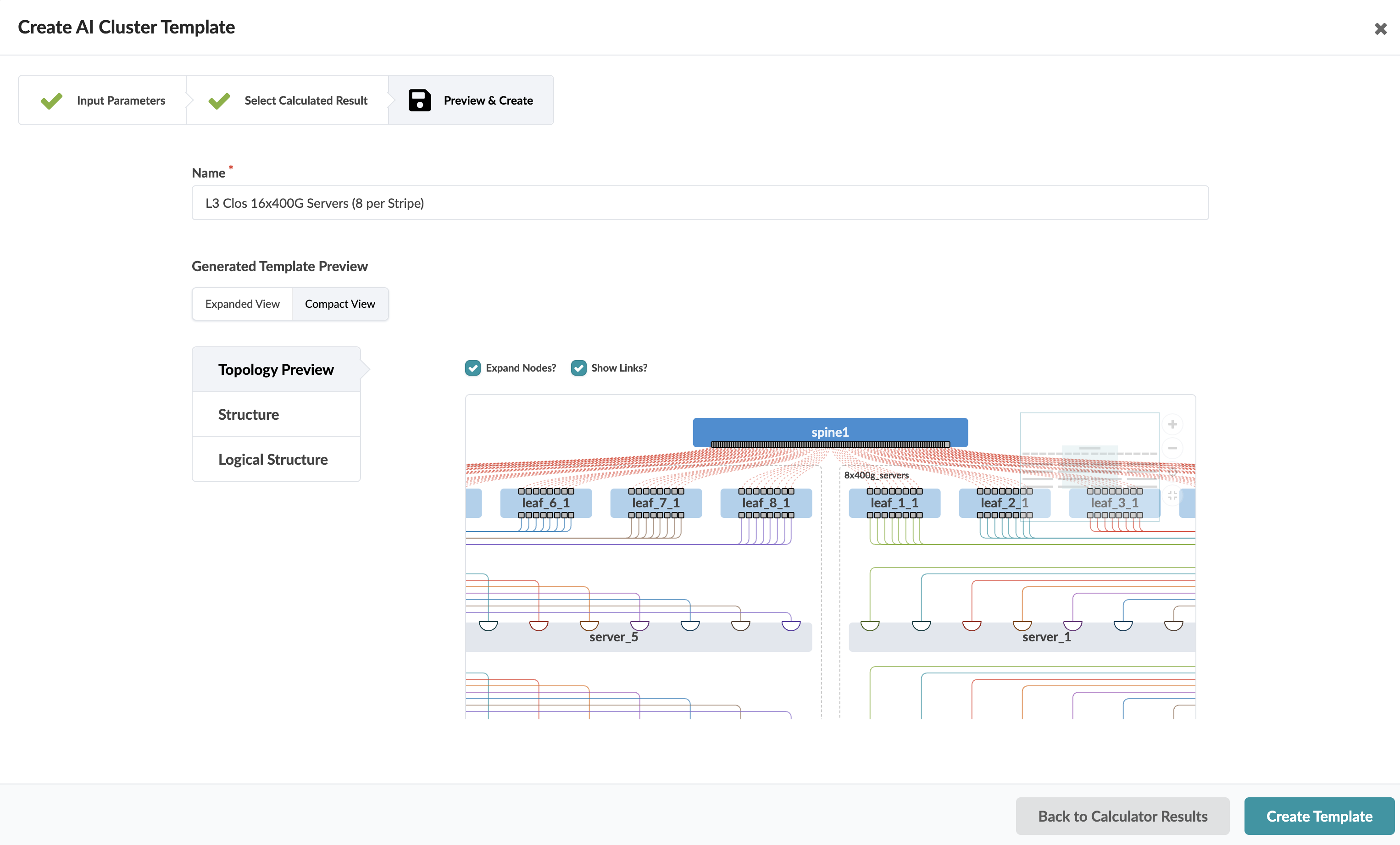 The template preview opens for your review. This preview renders a topology of your AI cluster, and provides port and logical structure information. Hover over elements of the rendered topology for more information. -